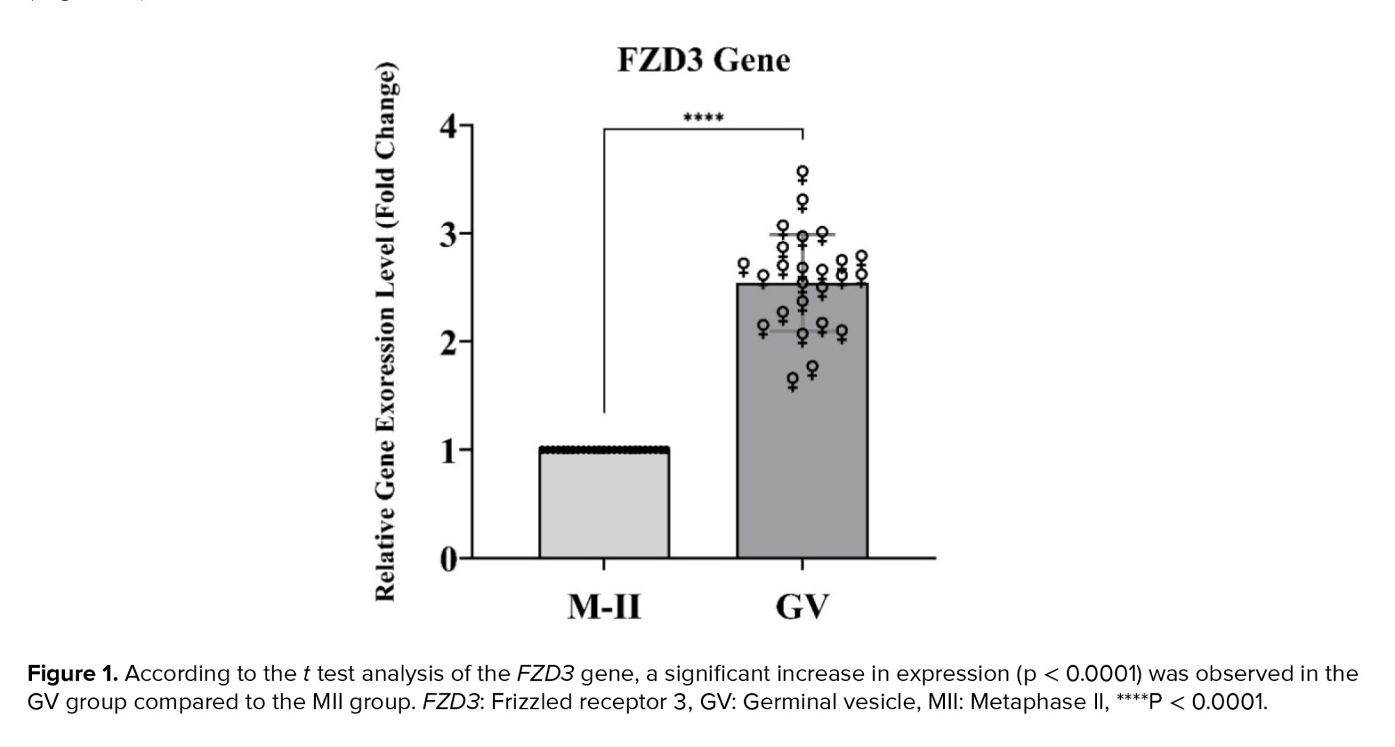 The study's statistical results indicate an increase in FZD3 gene expression in the GV group compared to the MII group (p < 0.0001). The statistical details of these results are shown below (Figure 1).