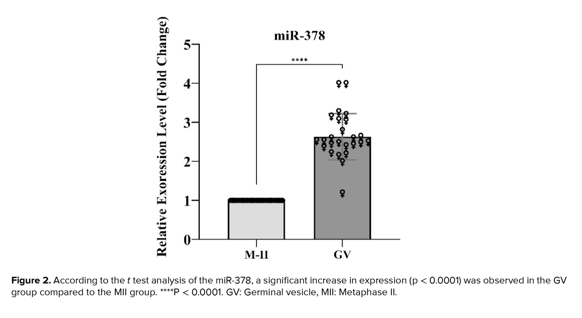 Regarding miR-378, the analysis of the results also indicated a significant increase in expression in the GV group compared to the MII group (p < 0.0001). The statistical details of these results are mentioned below (Figure 2).