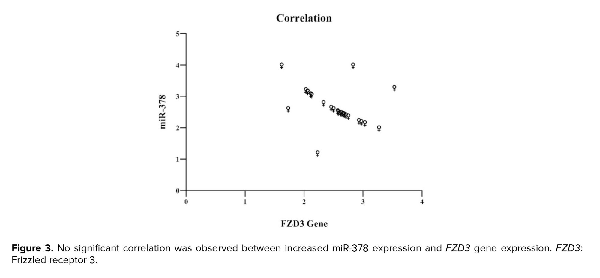Next, the hypothesis was examined through a correlation test to determine whether there was a significant relationship between the increase in miR-378 expression and the FZD3 gene. The results indicated no significant relationship between these 2 factors' increasing (Figure 3).