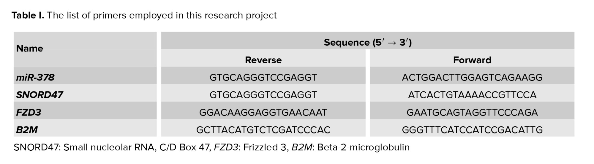 Subsequently, the quantitative real-time polymerase chain reaction method was used to measure the expression of FZD3, for miRNA reverse transcriptase stem-loop, to the miR-378 synthesis designed by AnaCell (AnaCell, Iran). The quantitative real-time polymerase chain reaction method was used to determine the expression of miR-378. Internal controls included Beta-2-microglobulin (B2M) (16) and small nucleolar RNA, C/D Box 47 (SNORD47) (17) (Table I).
