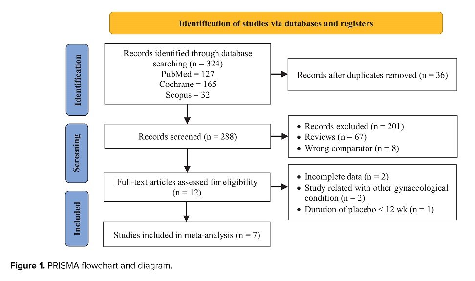 The primary search results yielded a total of 105 articles; after hand exclusion of case reports/series and review papers and removing duplicates, a total of 88 were screened. After screening the titles and abstracts, full papers were identified for further assessment based on the promulgated inclusion criteria. 61 articles were excluded, while 7 others were review articles and 8 articles had wrong comparator from placebo. Only 12 articles passed the step for full-text eligibility assessment. 2 articles had incomplete data, 2 other articles included other gynecological conditions, and one article included placebo < 12 wk. Ultimately, 7 RCT studies were included in our analysis of systematic review and meta-analysis from different countries. Figure 1 depicts the results of the literature search, including the basis for excluding certain publications. The baseline characteristics of the included studies in the final review were presented in table II (8-14).