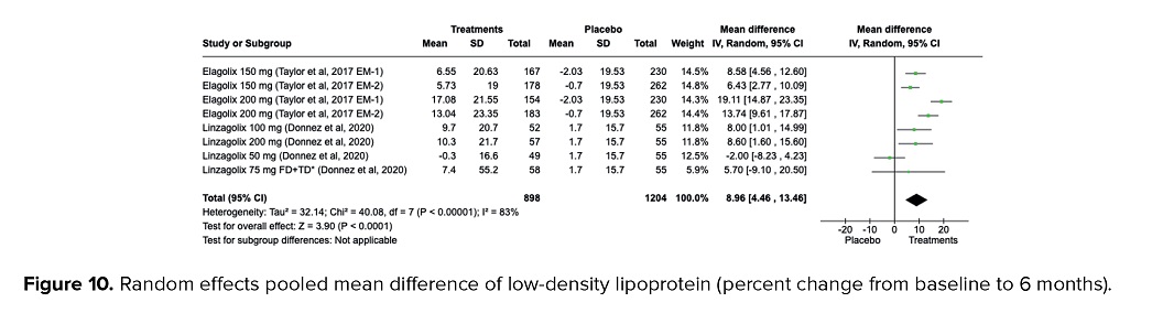 A significant increase of 8.96% was observed in the level of low-density lipoprotein (LDL) after 6 months compared to the baseline in participants receiving treatment using oral GnRH antagonists compared to placebo (MD = 8.96%, 95% CI = 4.46, 13.46, p < 0.001). High heterogeneities were detected (I2 = 83%, p < 0.001) as presented in figure 10.