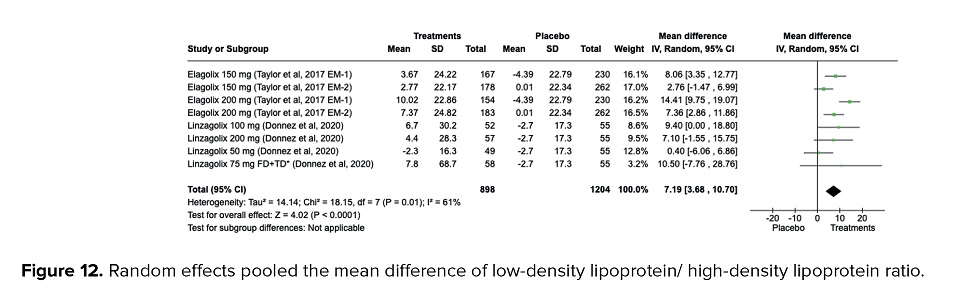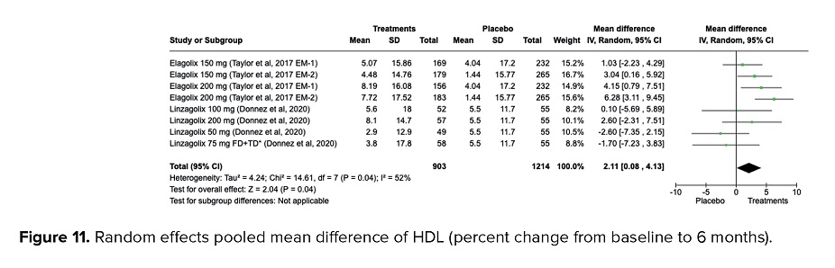 Analyzing the level of high-density lipoprotein (HDL) in participants receiving oral GnRH antagonists, a pooled change of 2.11% increase was observed in the level of HDL compared to placebo after 6 months of treatment (MD = 2.11%, 95% CI = 0.08, 4.13, p = 0.04). High heterogeneities were detected (I2 = 83%, p < 0.001) as presented in figure 11.