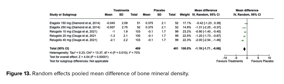 Participants who underwent treatment using GnRH antagonists had significantly lower levels of BMD compared to placebo in spinal assessment (MD = -1.19, 95% CI = -1.71, -0.68, p < 0.001). Moderate heterogeneities were detected in pooled studies assessing spinal BMD (I2 = 70%, p = 0.010), as presented in figure 13.