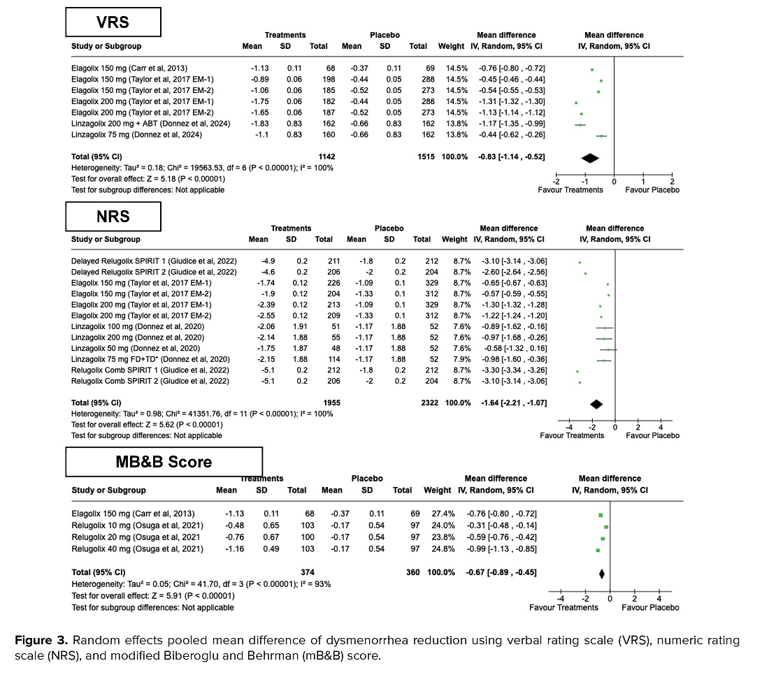 Participants who underwent treatment using GnRH antagonists had a significant reduction of dysmenorrhea using VRS (MD = -0.83, 95% CI = -1.14, -0.52, p < 0.001), NRS (MD = -1.64, 95% CI = -2.21, -1.07, p < 0.001), and mB&B score (MD = -1.64, 95% CI = -2.21, -1.07, p < 0.001) (Figure 3). High heterogeneities were detected in VRS group (I2 = 100%, p < 0.001), NRS group (I2 = 100%, p < 0.001), and mB&B score (I2 = 93%, p < 0.001), respectively.