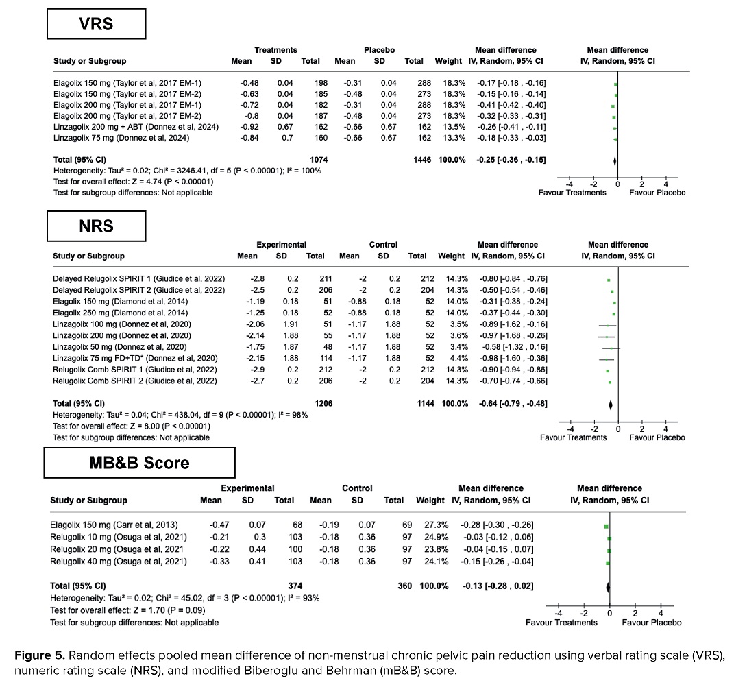 Women who underwent treatment using GnRH antagonists had a significant reduction of NMCPP using VRS (MD = -0.25, 95% CI = -0.36, -0.15, p < 0.001) and NRS (MD = -0.64, 95% CI = -0.79, -0.48, p < 0.001). However, for the mB&B score, despite a reduction of -0.13 in MD, the effect size failed to attain statistical significance (95% CI = -0.28, 0.02, p = 0.09). High heterogeneities were detected in VRS group (I2 = 100%, p < 0.001), NRS group (I2 = 98%, p < 0.001), and mB&B score (I2 = 93%, p < 0.001), respectively (Figure 5).
