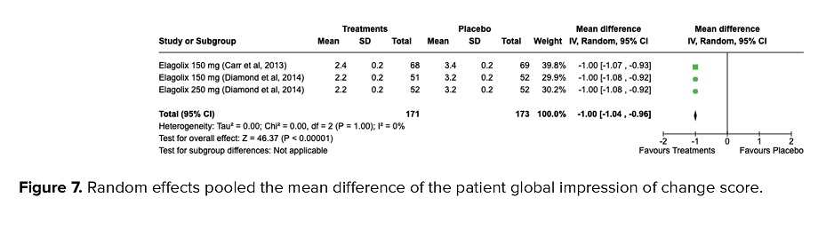 The self-report measures a PGIC and reflects an individual's belief about the efficacy of treatment. Lower levels showed much improvement. In this study, women who underwent treatment using GnRH antagonists had a significant improvement in the treatment arms with PGIC score (MD = -1.00, 95% CI = -1.04, -0.96, p < 0.001). No heterogeneities were detected (I2 = 0%, p = 1.00) as presented in figure 7.