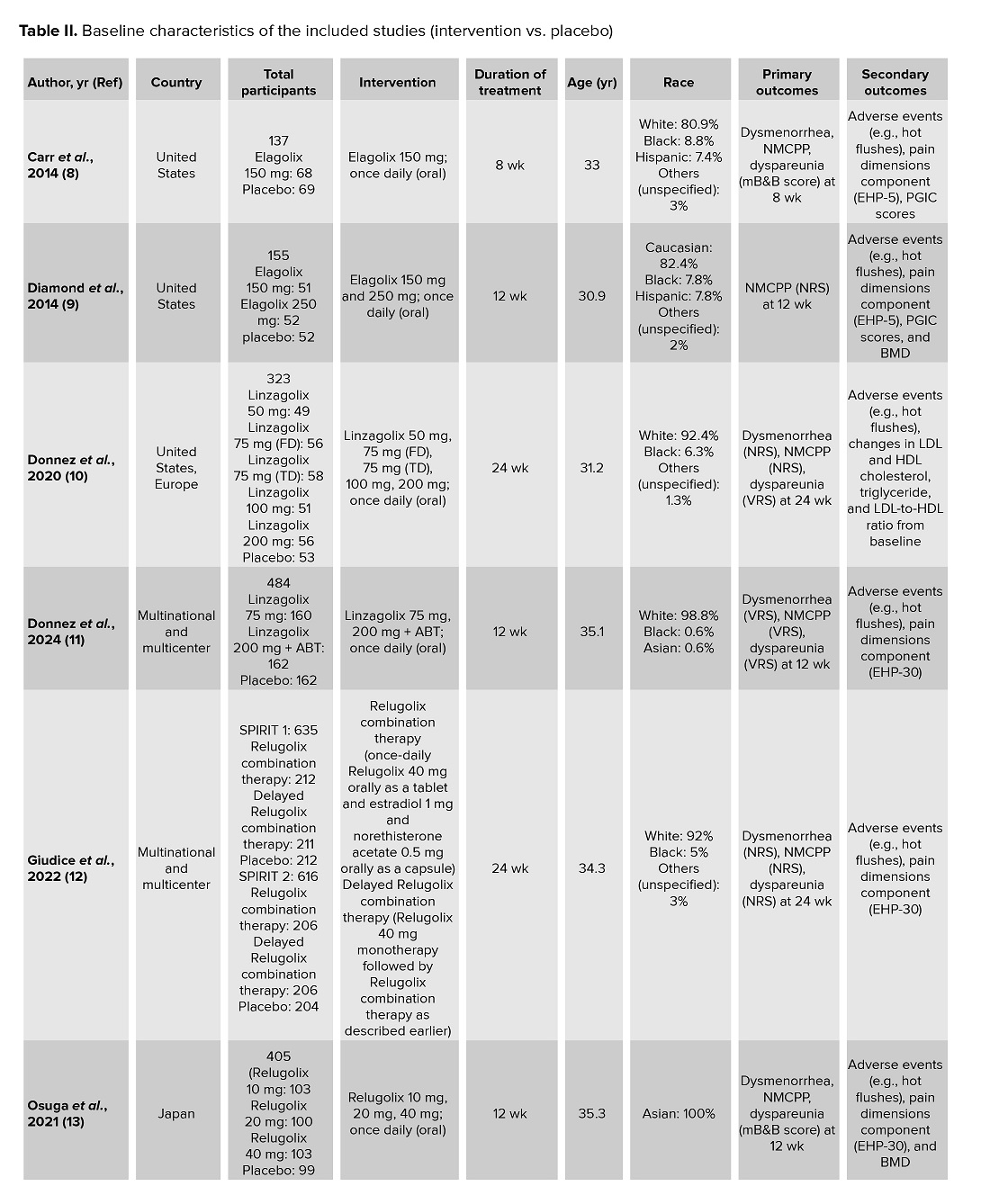 In terms of study design and country of origin, the included studies in this article varied widely worldwide (Table II). All of the studies included are RCTs. Based on table II (8-14). The types of oral GnRH antagonist treatments vary in types (Elagolix, Linzagolix, and Relugolix) and dosage. Each experiment also has quite varied inclusion and exclusion criteria with fairly homogeneous primary and secondary outcomes. The majority of studies have a similar follow-up duration.
