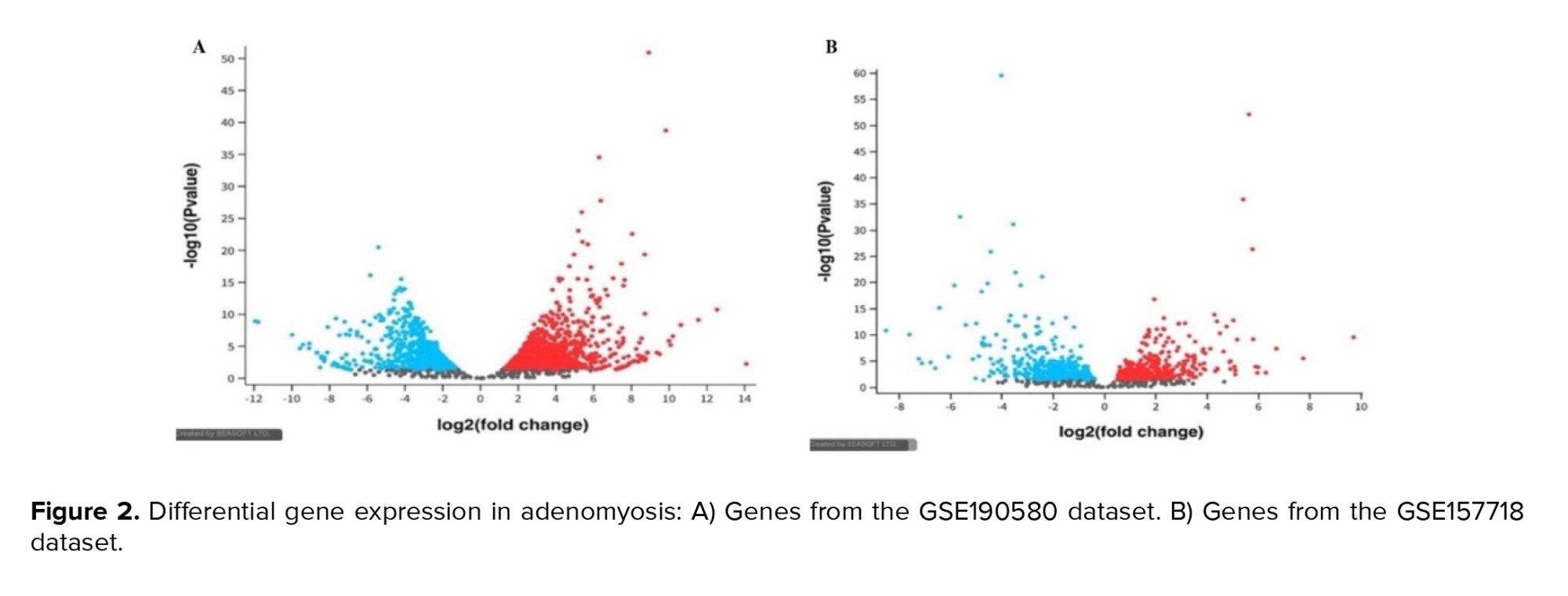 Figure 2 display the volcano plots of DEGs identified from GSE190580 and GSE157718 datasets, respectively, illustrating significant upregulation and downregulation of inflammation-related genes in adenomyosis compared to controls. The blue dots represent genes significantly affected by normal control. These genes likely play roles in maintaining normal endometrial physiology, including cellular homeostasis, immune regulation, and tissue repair. The red dots represent genes affected considerably by adenomyosis. Genes upregulation in GSE190580 (blue color), genes upregulation in GSE157718 (red color), and genes with the non-significant changes in expression (grey color). Positive log2 (fold change) values indicate upregulation in gene expression, while negative values indicate downregulation. The y-axis represents the -log10 (Padj) value, which shows the statistical significance of the observed changes in gene expression.