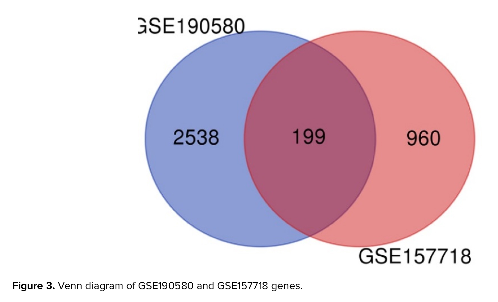 Figure 3 displays a total of 199 overlapping genes. Utilizing ShinyGO for analysis unveiled the functions of these shared genes, of which 199 are linked to adenomyosis. From the GSE 190580 dataset, 2538 unique genes were identified, while from GSE 157718, 960 distinct genes were obtained, without any overlap between the 2 datasets.