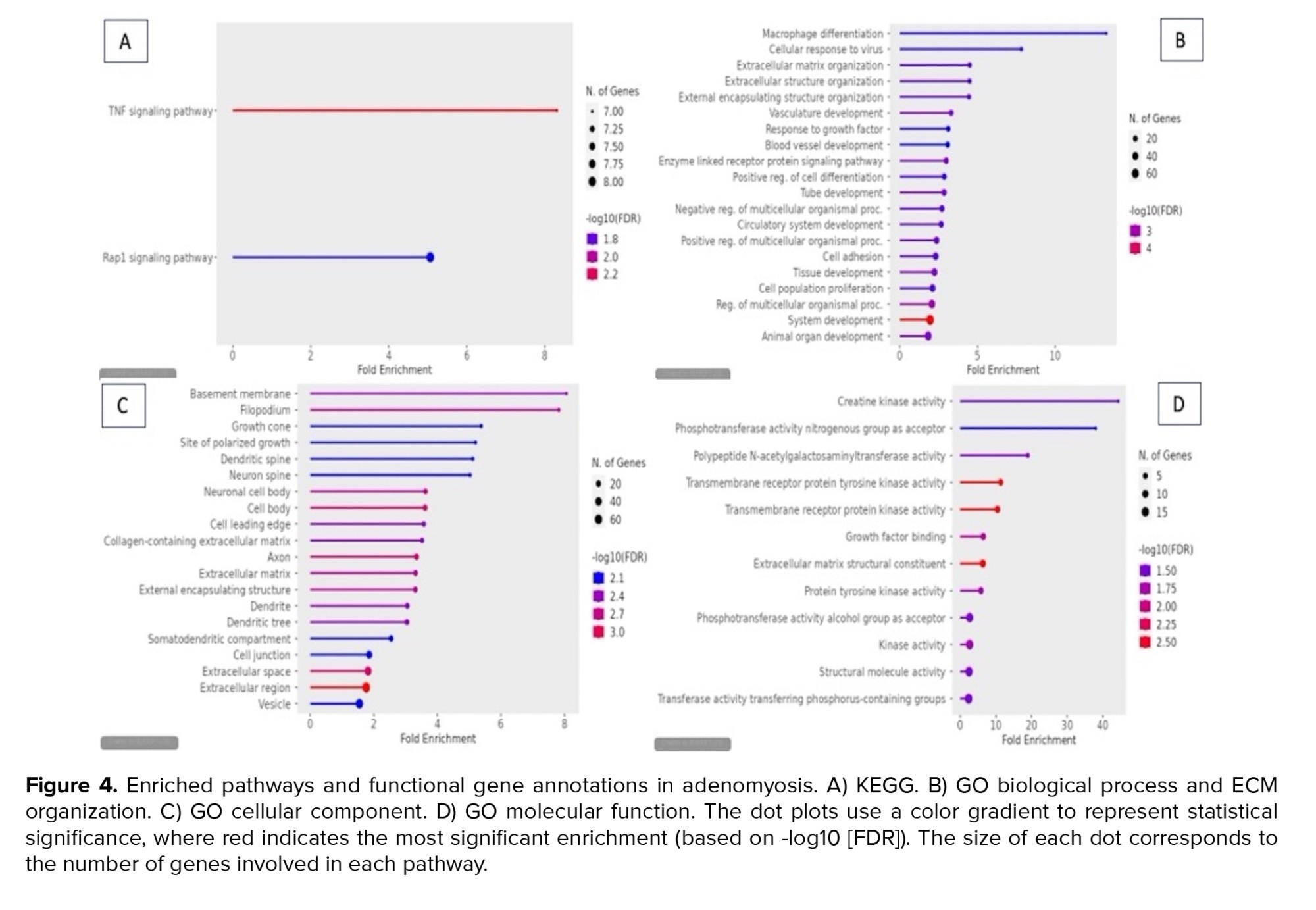 The gene ontology (GO) biological process enrichment analysis depicted in the figure highlights multiple biological processes that may be associated with adenomyosis. Notable processes include macrophage differentiation, extracellular matrix (ECM) organization, cellular response to virus, and vasculature development. Macrophage differentiation shows the highest enrichment, suggesting a strong role of immune cells in the inflammatory responses in adenomyosis. Macrophages are key players in tissue remodelling, inflammation, and fibrosis, all of which are critical in the abnormal uterine growth seen in adenomyosis (15).
