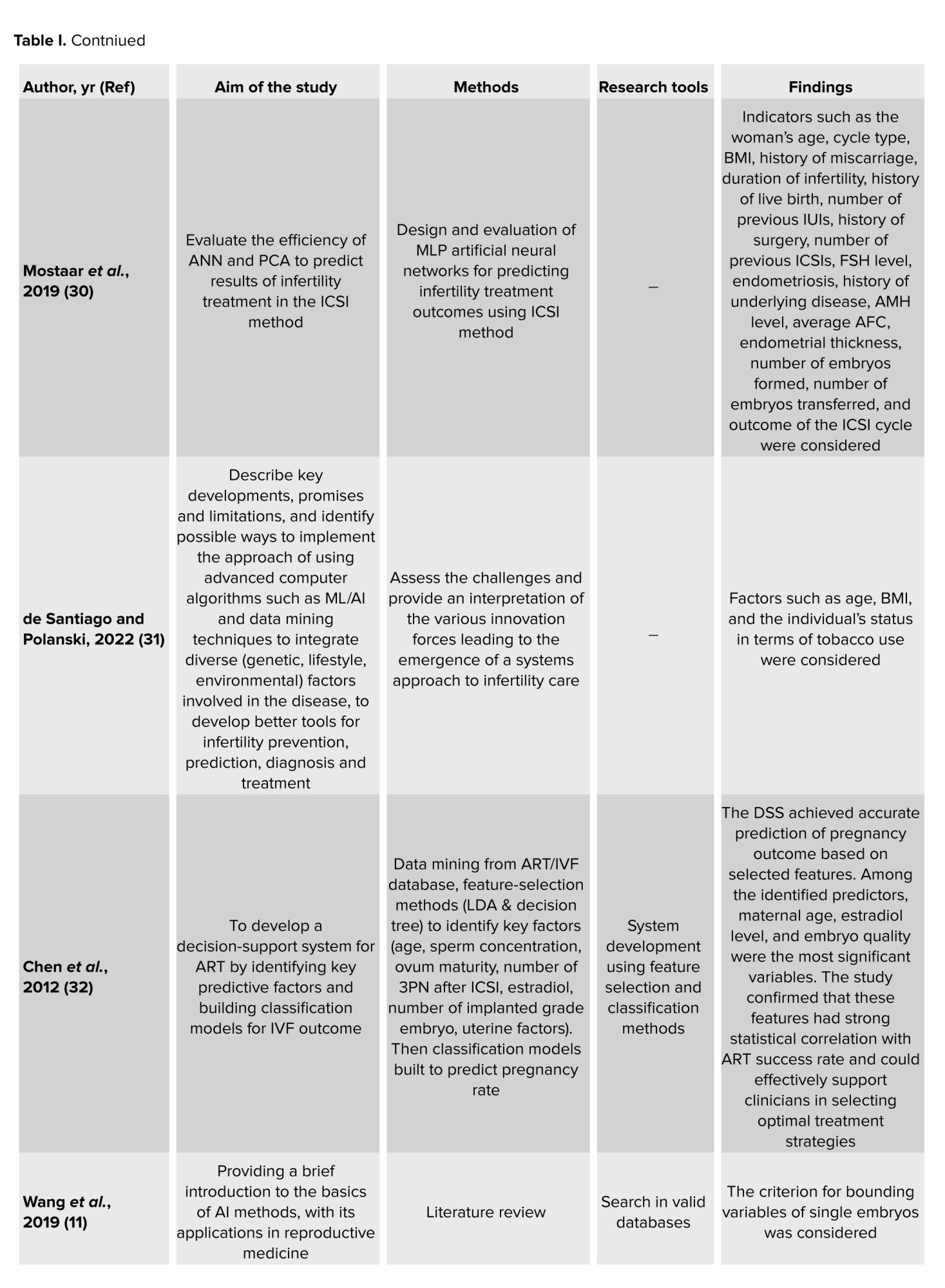 Similar to our study, a systematic review investigated the application of AI, clinical decision support algorithms, mathematical models, and calculators in infertility. Key components identified in the development of clinical decision support algorithms in infertility included BMI, lifestyle factors, the number of previous treatments, a presumptive diagnosis of infertility, and an assessment of IVF cycle outcomes (38).