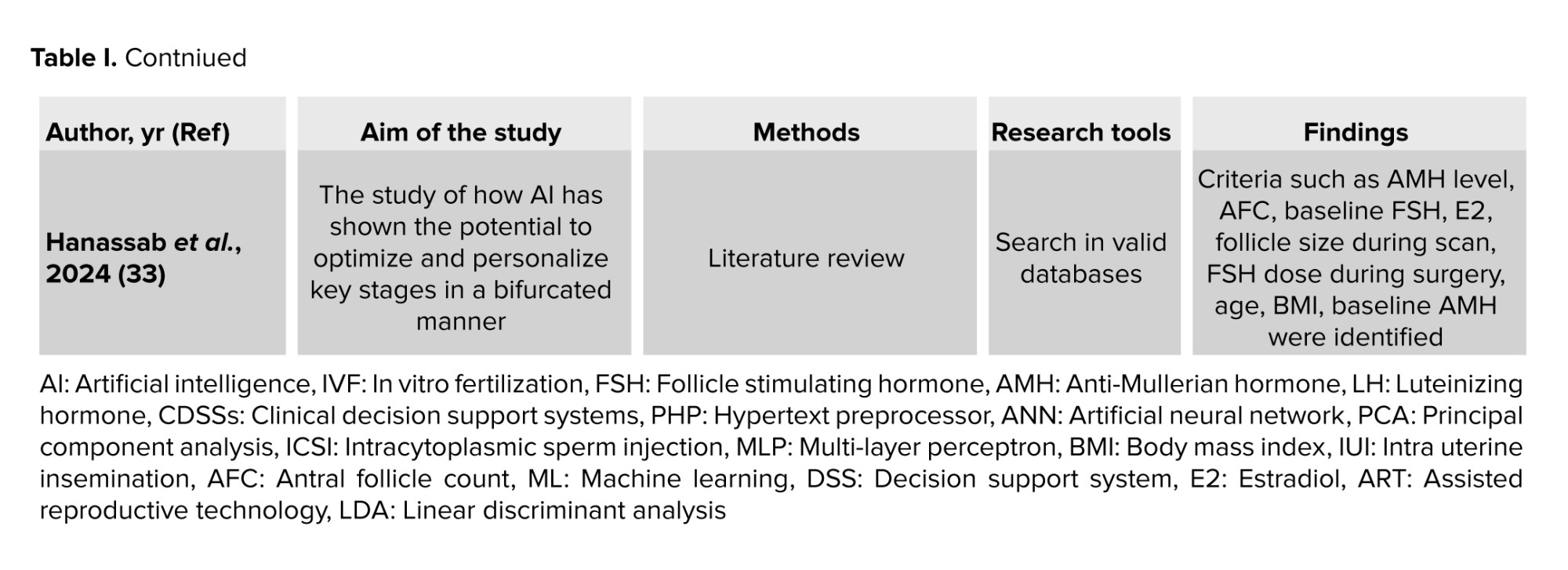 In second step, popular search engines like Google, Yahoo, and Bing were used. The search procedure was such that, first, the systems that were identified from the first method (scientific databases) were searched using the phrase "systems similar to" in the mentioned search engines. Similar systems not mentioned in scientific articles were identified by relying on this method. Also, to complete the searches, AI tools such as ChatGPT, Gemini, and Perplexity were asked to introduce existing systems in infertility. Furthermore, describe the characteristics and data required in DSS for infertility.