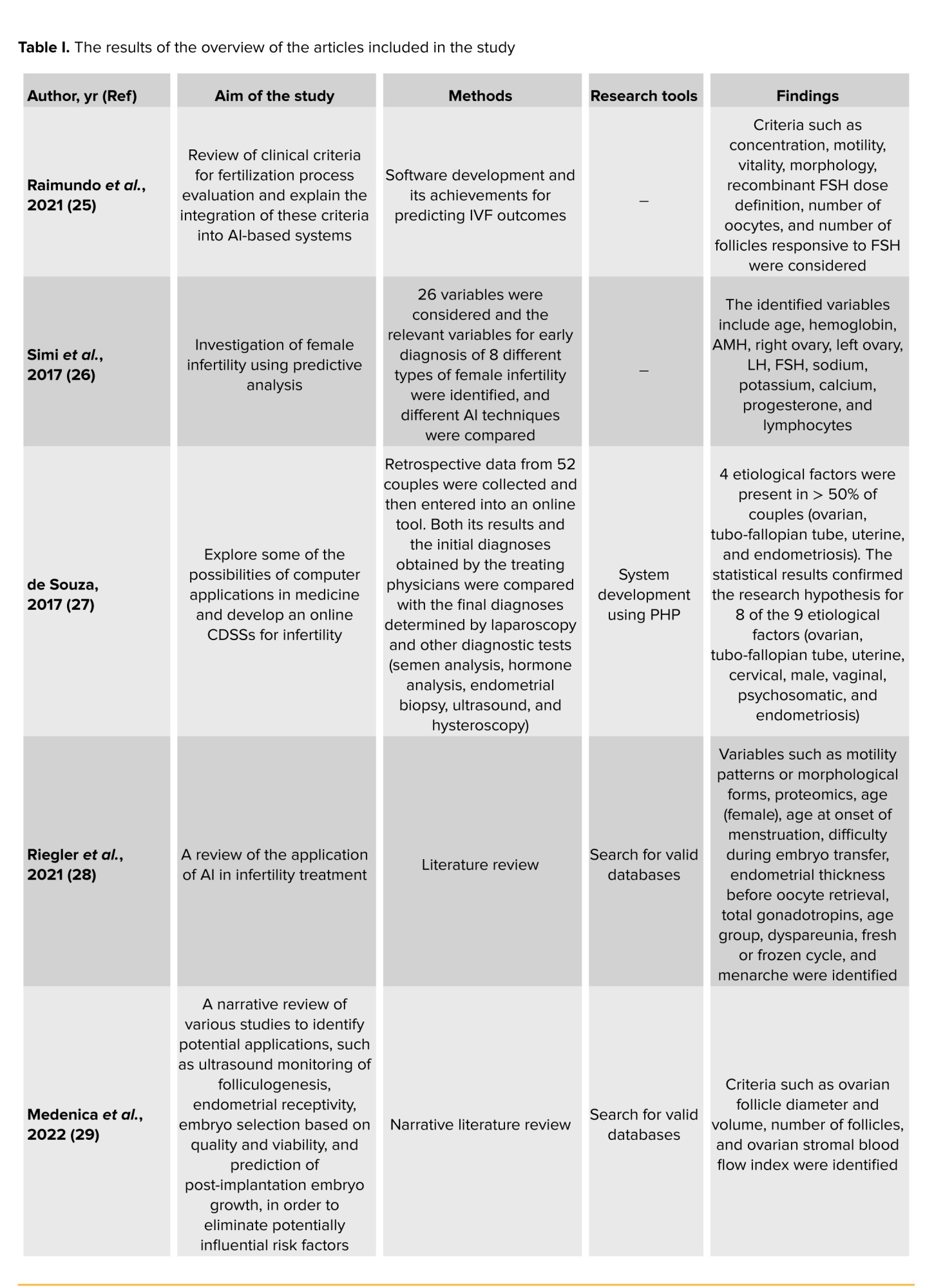 The inclusion criteria for systems included systems found through reputable and well-known articles and search engines in health, treatment, and infertility. Although systems that had been implemented and used by users were also excluded from the study.
