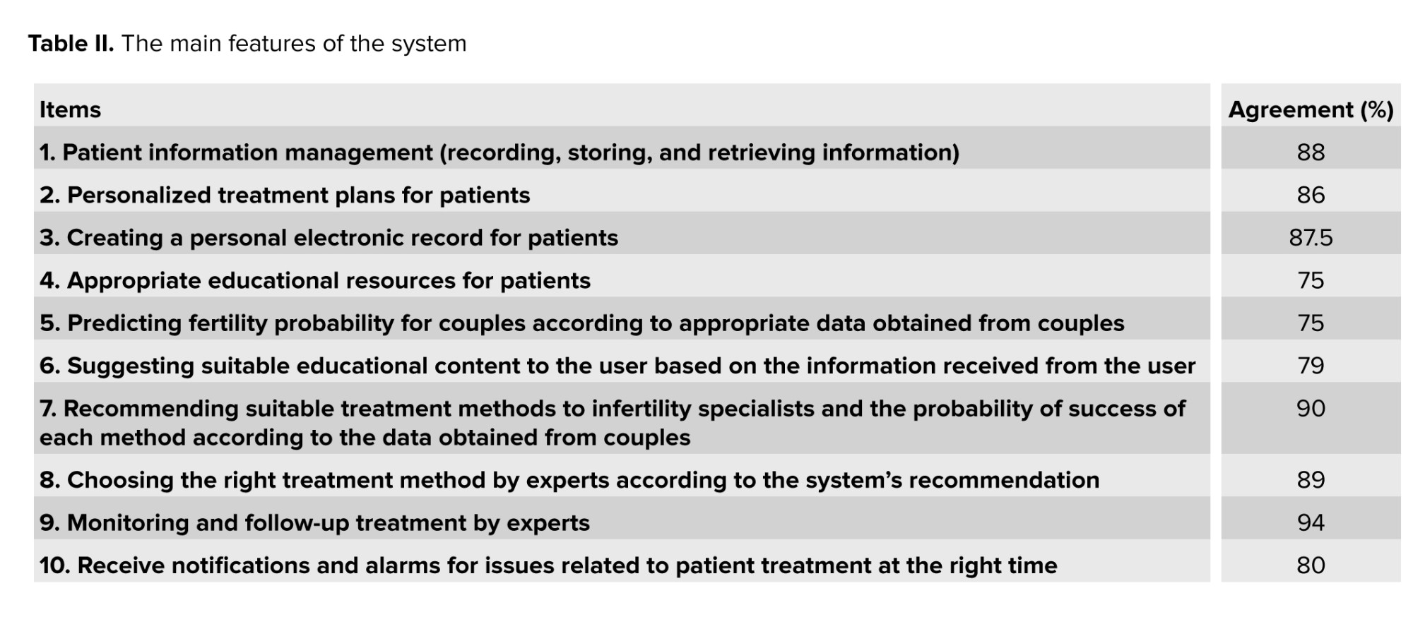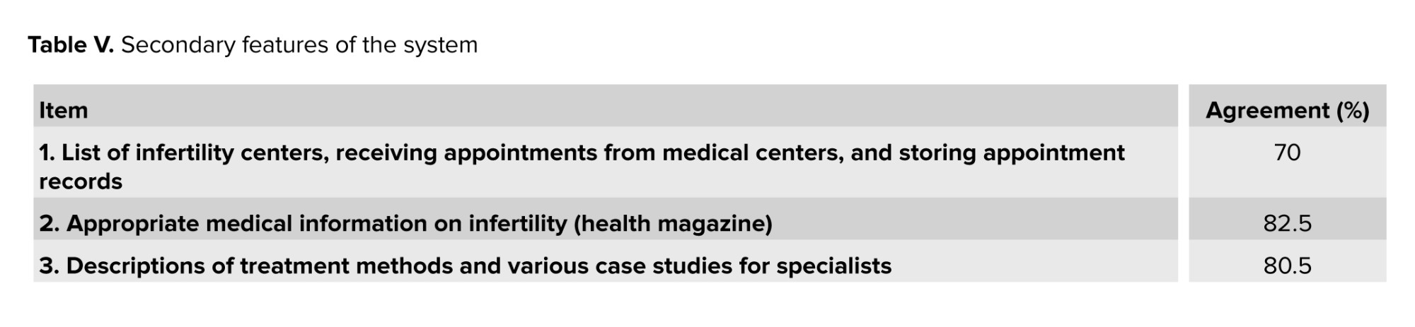 Table V illustrates the system’s secondary features. The highest level of agreement among experts was on “Appropriate medical information in infertility (health magazine)”, with 82.5% agreement, and the lowest level of agreement was on “List of infertility centers, receiving appointments from medical centers and storing appointment records”, with 70% agreement.
