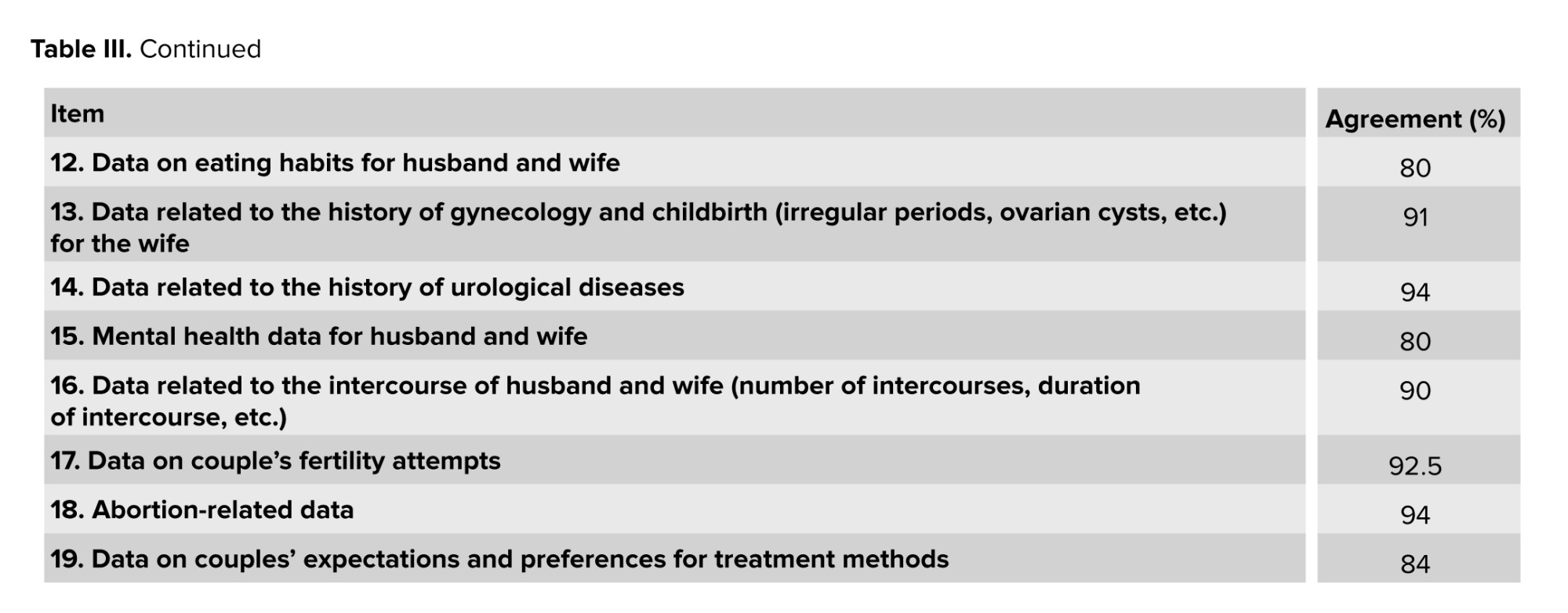 Table IV demonstrates the data related to predicting the probability of having children for couples. The highest level of agreement among experts was on “Abortion-related data”, with 90% agreement, and the lowest level of agreement was on “Demographic data (name, date of birth, address, age, sex, ethnicity, and length of the marriage) for husband and wife”, with 73% agreement.