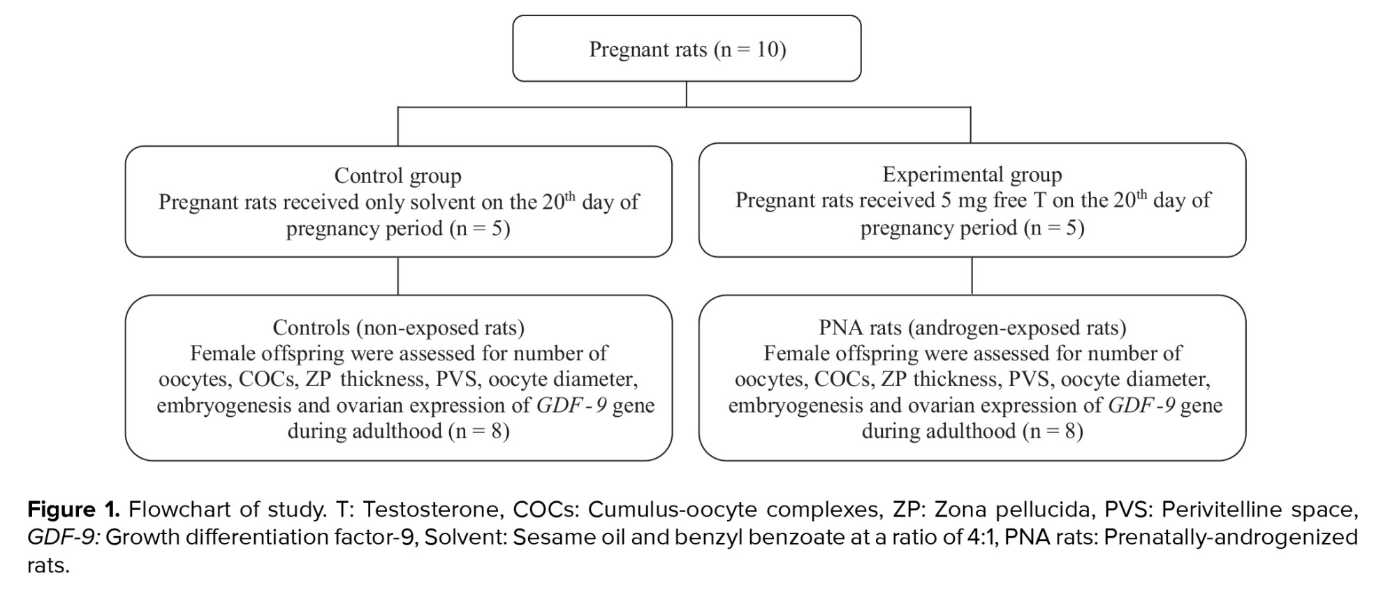 The present study utilized the methodology previously established for the induction of a rat model of PCOS (5). In summary, pregnant rats were randomly assigned to either an experimental or a control group (n = 5/group). On gestational day 20, rats in the experimental group received a subcutaneous injection of 5 mg free testosterone (T1500; Sigma, Steinheim, Germany) dissolved in 500 µl of a vehicle composed of sesame oil (S3547; Sigma) and benzyl benzoate (B6630; Sigma). In contrast, control group rats were administered 500 µl of the vehicle solution alone, consisting of sesame oil and benzyl benzoate in a 4:1 ratio. After weaning period, female offspring of 2 groups, including prenatally-androgenized (PNA) rats (n = 8) and non-exposed rats (controls) (n = 8), were kept in cages in groups of 3 or 4 in standard animal housing conditions (12-hr light/dark cycle, a controlled temperature of 22 ± 3oC, and a relative humidity of 45-55%) with free access to food and water. PNA rats and their controls were followed until 70-85 days of age (adulthood) and studied in terms of oocyte and embryo quality as well as ovarian expression of the GDF-9 gene (Figure 1).