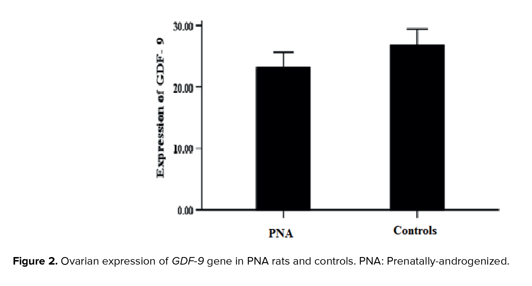 No statistically significant difference was observed in the ovarian expression of the GDF-9 gene between 2 study groups (PNA rats and controls) (p > 0.05) (Figure 2).