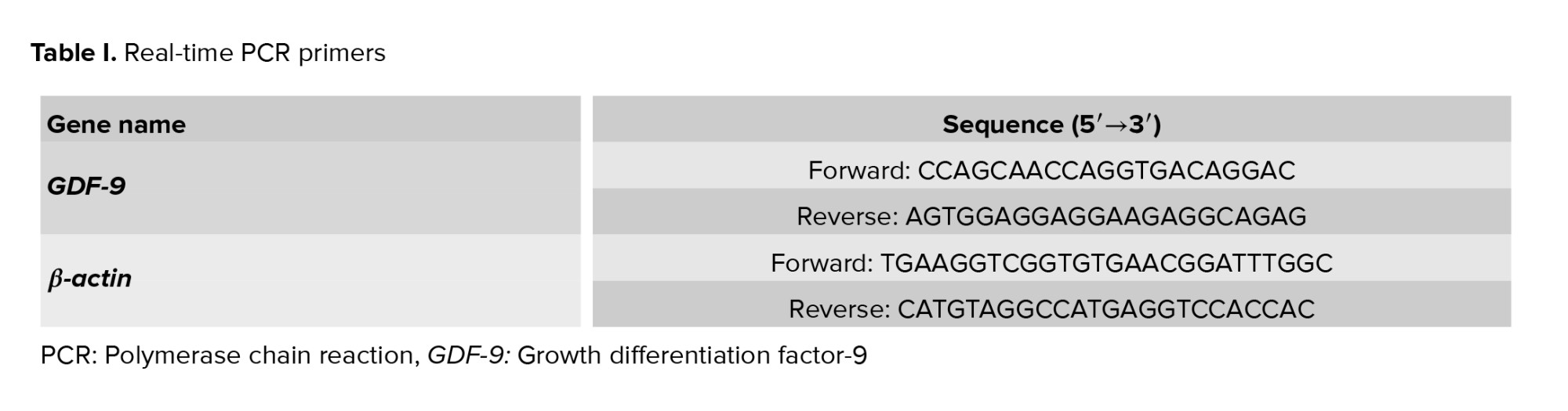 Total RNA was isolated from the ovarian tissue using the TRIzol method. RNA quantity and purity were assessed by measuring the absorbance ratio at 280/260 nm with a NanoDrop spectrophotometer (Thermo Fisher). To synthesize cDNA, the total RNA was treated with DNase I (Thermo Fisher Scientific, USA) to prevent genomic DNA contamination. Subsequently, the total RNA was converted into cDNA using the cDNA synthesis kit (4500 YT, Yekta Tajhiz, Iran) via reverse transcription using random hexamer and initial oligo-dT reaction according to the manufacturerʼs instructions. To assay the expression of the GDF-9 gene in ovarian tissue, qRT-PCR was performed using SYBR-Green and the primers (sequences are listed in table I). Gene duplication process was done using applied biosystem and SYBR-green master mix (Ampliqon). The melting curve is used to ensure the lack of non-specific product proliferation and primer dimer. Melting curve analysis did not show any primer dimer and non-specific products in the assay. The cycle threshold was determined. The gene expression level was calculated using the 2-ΔΔCt method and using β-actin as a reference gene. The analysis of gene expression was performed using the Livak method as relative fold change.
