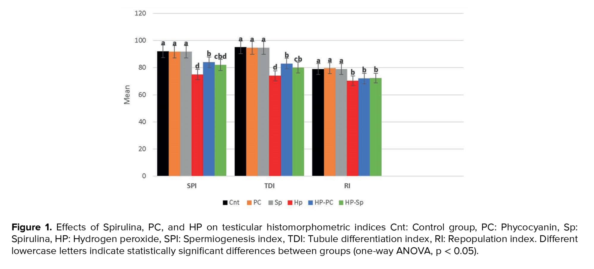 HP exposure significantly decreased the SPI, TDI, and RI compared to other groups (p = 0.01). However, SPI and TDI improved significantly in the HP-Sp and HP-PC groups compared to the HP-only group (p = 0.01) (Figure 1).
