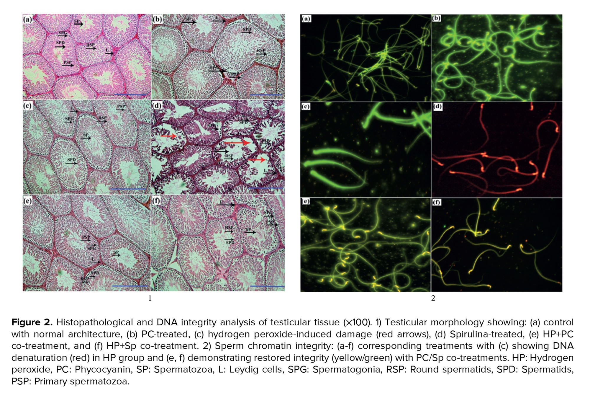 C-PC powder (Merck, Germany, product code 11016-15-2) and Spirulina powder (Merck, Germany, product code 724424-92-4) were freshly prepared as suspensions for oral administration. The outcome measures, included 1) sperm parameters (count, motility, and viability); 2) oxidative stress markers (superoxide dismutase [SOD] activity, malondialdehyde [MDA] concentration, total thiol concentration [TTC], total antioxidant capacity [TAC], total oxidant status [TOS], and carbonyl protein [CP] content); 3) histopathological indices (tubule differentiation index [TDI], repopulation index [RI], and spermiogenesis index [SPI]); and 4) DNA integrity-DNA fragmentation index [DFI].