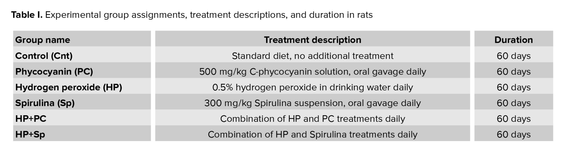 Rats were randomly assigned to 6 groups using a computer-generated randomization table to ensure unbiased allocation. Each rat was assigned a unique identification number, and the randomization process was performed by an independent researcher not involved in the experimental procedures (single-blinding). Only the first researcher was aware of the group assignments. The treatment period lasted for 60 days (Table I). Additionally, rats were acclimatized to laboratory conditions for at least 7 days before the experiment.