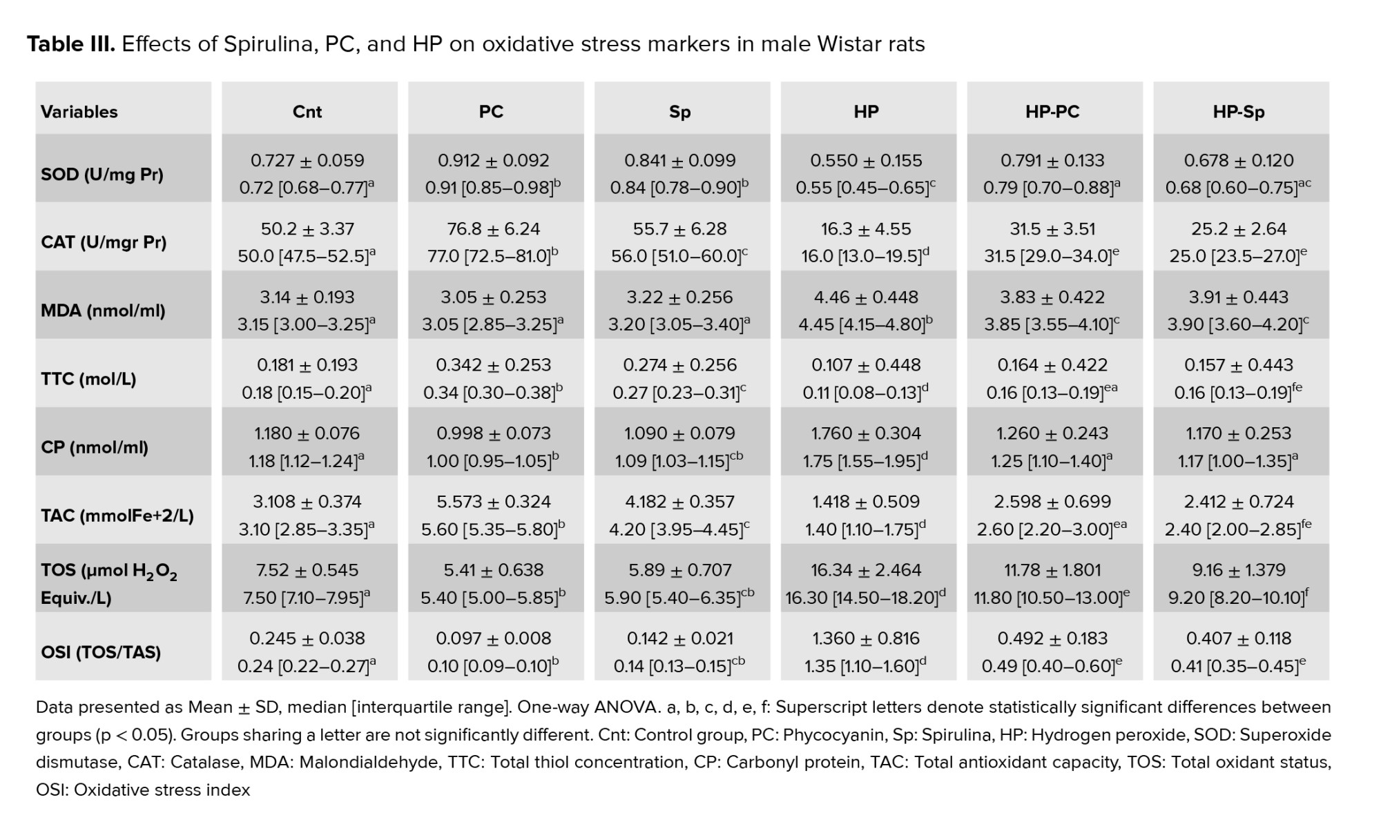 In the HP group, activities of SOD, catalase (CAT), TTC, and TAC were significantly lower compared to controls (p = 0.001). Conversely, MDA and TOS levels were higher in the HP group (p = 0.01). Treatment with PC or Spirulina significantly increased SOD, CAT, TTC, and TAC activities while reducing MDA and TOS levels in the HP-treated groups (p = 0.001) (Table III).