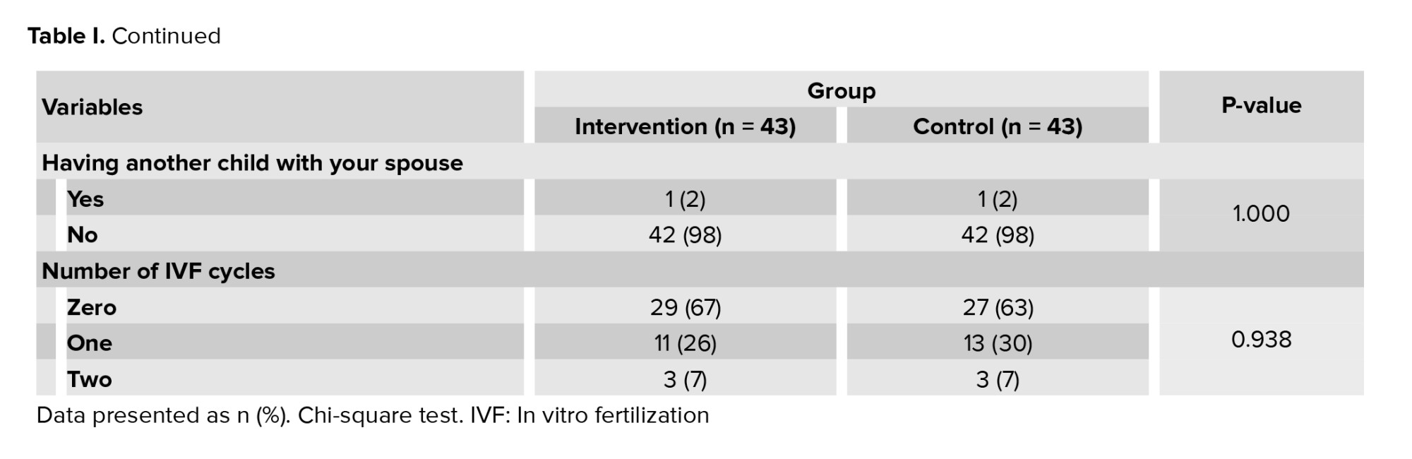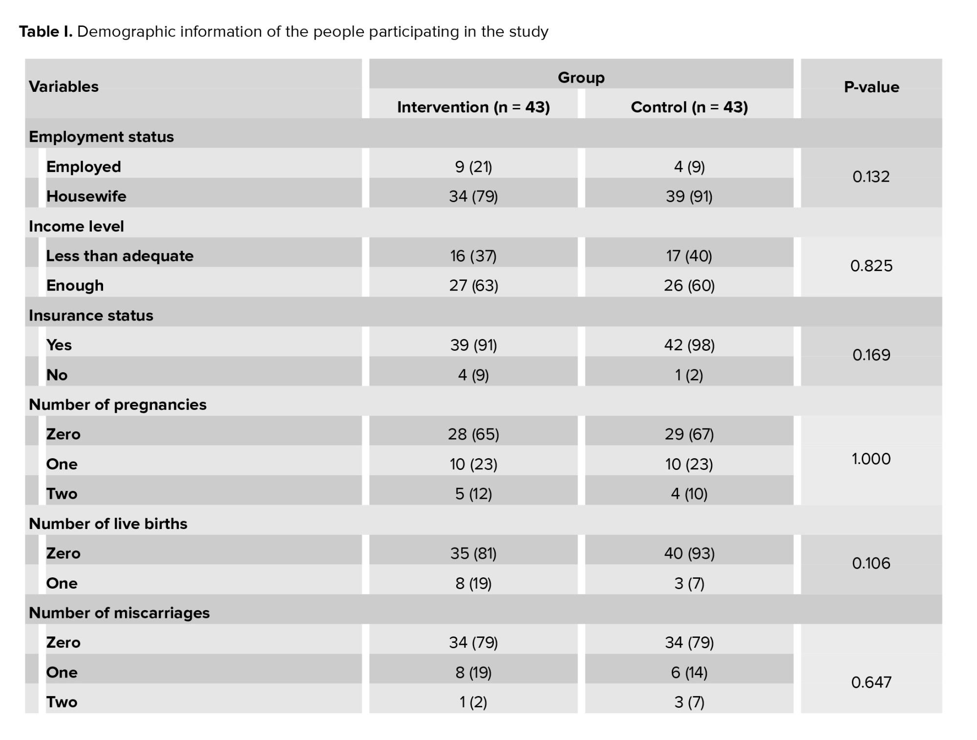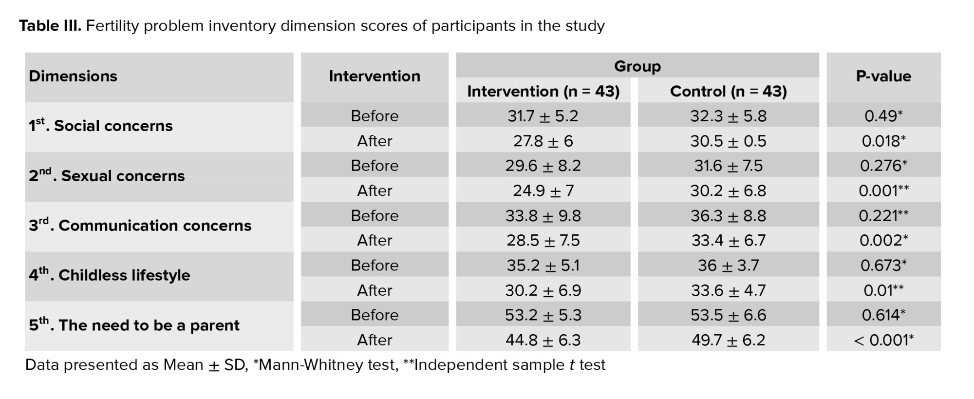 In total, 86 people who had the inclusion criteria participated in this study (Figure 1). The mean age of women in the intervention and control groups was 32.7 ± 6.5 and 33 ± 5.3 yr. The duration of infertility treatment in the intervention and control groups was 4.5 ± 3.7 and 3.8 ± 2.1 yr. Also, the number of IUI cycles in the intervention and control groups was 0.9 ± 0.9 and 1.1 ± 1. According to the independent t test, no statistically significant difference was observed in the age distribution (p = 0.829), and according to the Mann-Whitney test, the duration of infertility treatment (p = 0.879) and the number of IUIs (p = 0.51) in both intervention and control groups and the 2 groups were homogeneous with each other. Other demographic information, including employment status (p = 0.132), income level (p = 0.825), insurance status (p = 0.169), number of pregnancies (p = 1.000), number of live births (p = 0.106), number of miscarriages (p = 0.647), having another child with the spouse (p = 1.000) and number of IVF cycles (p = 0.938), did not show any significant statistical difference between the 2 intervention and control groups based on the Chi-square test, and the 2 groups were similar to each other (Table I).