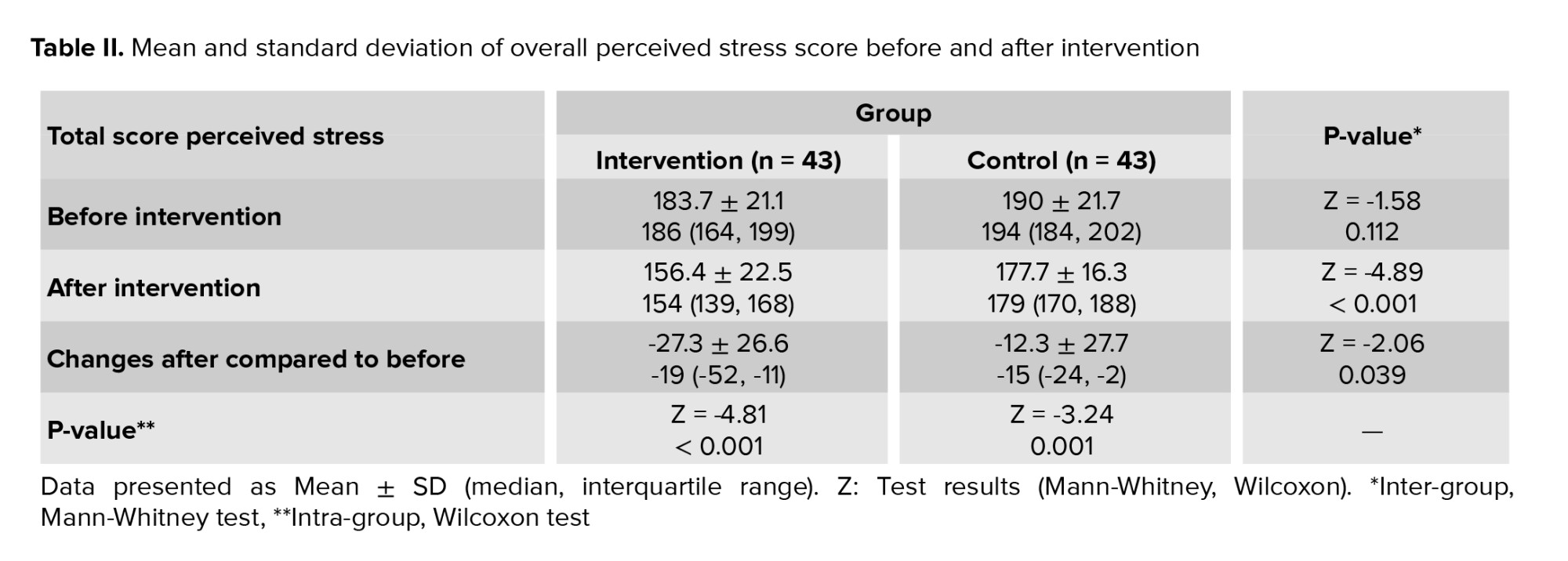 Before the intervention, the mean and standard deviation of the overall stress score of participants in the intervention group was 183.7 ± 21.1, and in the control group, it was 190 ± 21.7. No significant difference was observed in the Mann-Whitney test (p = 0.112). After the intervention, the mean and standard deviation of the total stress score of the participants in the intervention group was 156.4 ± 22.5, and in the control group was 177.7 ± 16.3. The Mann-Whitney test showed this difference to be significant (p < 0.001). The mean total stress score decreased by -27.3 ± 26.6 and -12.3 ± 27.7 in the intervention and control groups, respectively, compared to before the intervention. The Mann-Whitney test showed this difference to be significant (p = 0.039). In the intra-group comparison, the Wilcoxon test results showed that in the intervention group, the mean total stress score after the intervention was lower than the mean before the intervention, and a statistically significant difference was observed (p < 0.001). Also, the result of the Wilcoxon test showed that in the control group, the mean total stress score after the intervention was significantly different from the mean before the intervention (p = 0.001) (Table II).