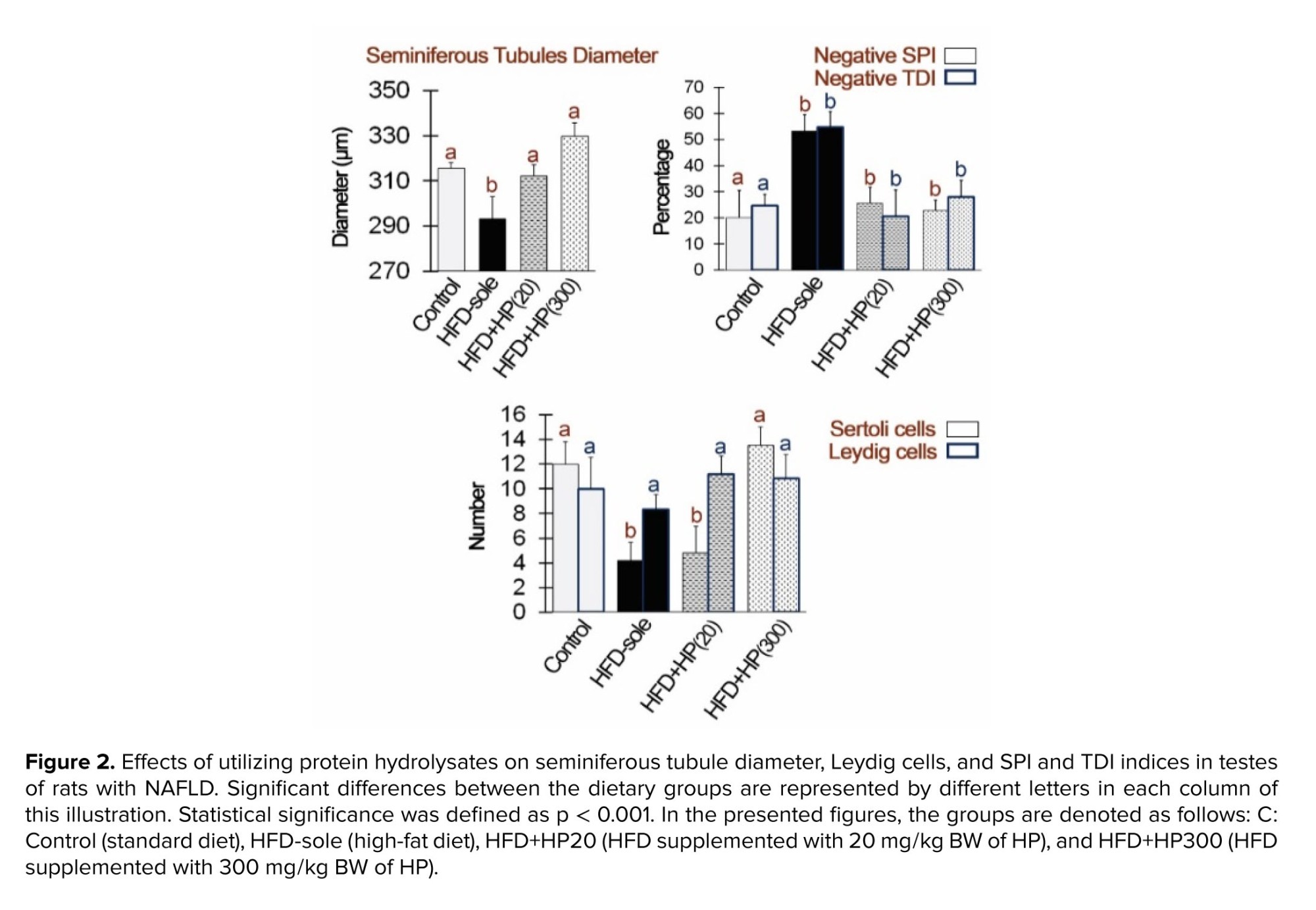 Non-alcoholic fatty liver disease (NAFLD) is characterized by excessive hepatic lipid accumulation and may progress to non-alcoholic steatohepatitis, cirrhosis, or cancer (1). Oxidative stress (OS) is central to NAFLD pathogenesis (2) and causes Sertoli and germ cell dysfunction (3). NAFLD-induced reactive oxygen species (ROS) increase lipid peroxidation and disrupt spermatogenesis (4). Approximately 40% of infertile men are affected by NAFLD (5). Since no specific treatment exists and chemical drugs often cause adverse effects, alternative strategies are being investigated, including natural antioxidants such as bioactive peptides, which have shown potential to mitigate OS and improve liver health.