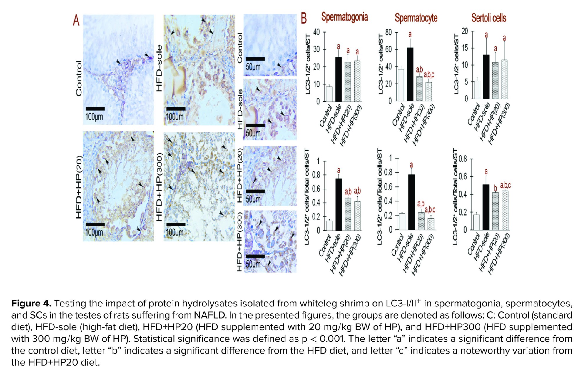 Javanmard S, Najdegerami E, Razi M, Nikoo M. An experimental study on shrimp bioactive peptides restoring testicular function in a rat model of fatty liver disease via autophagy, redox balance, and energy transporters. IJRM 2025; 23 (11) :937-952