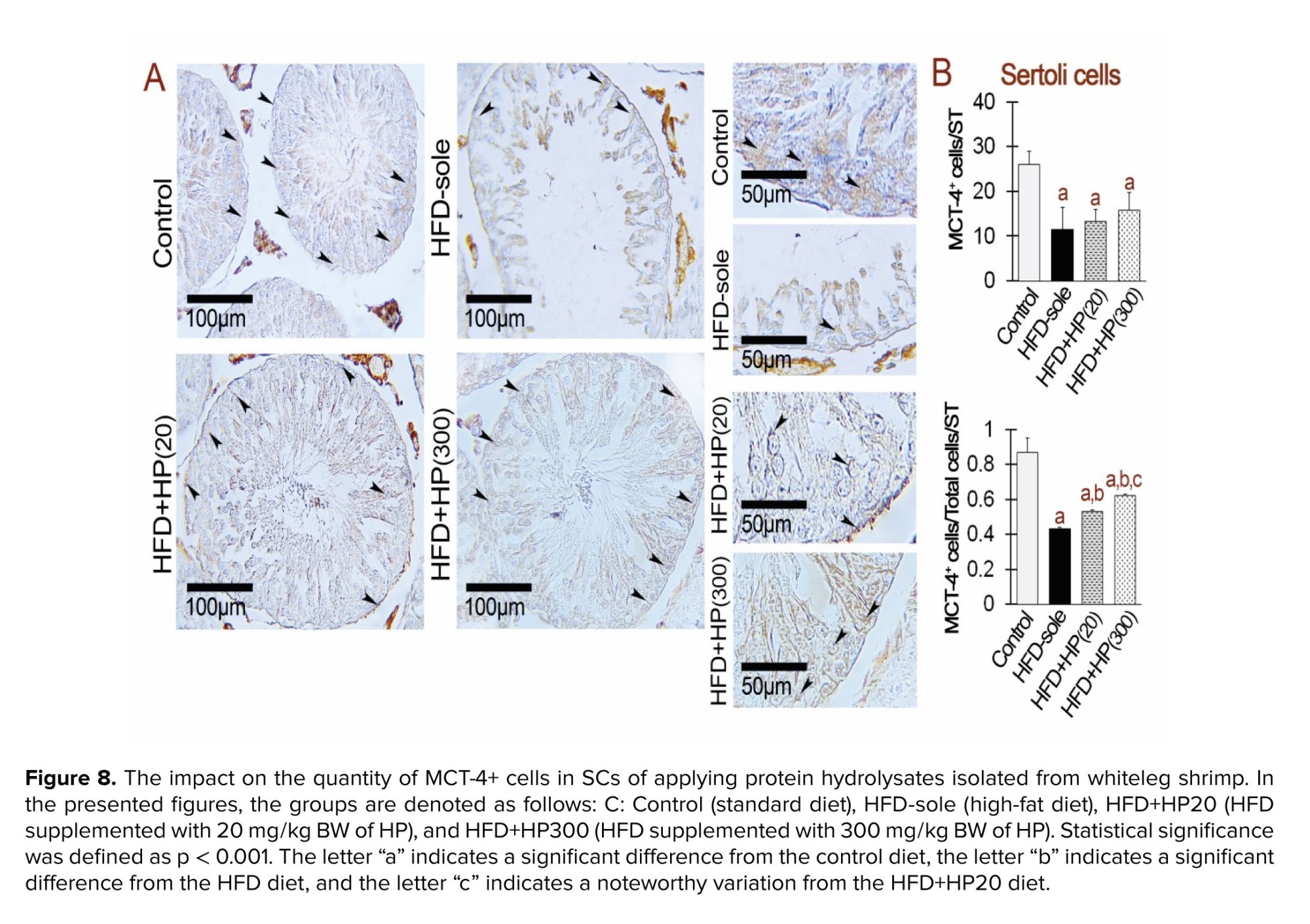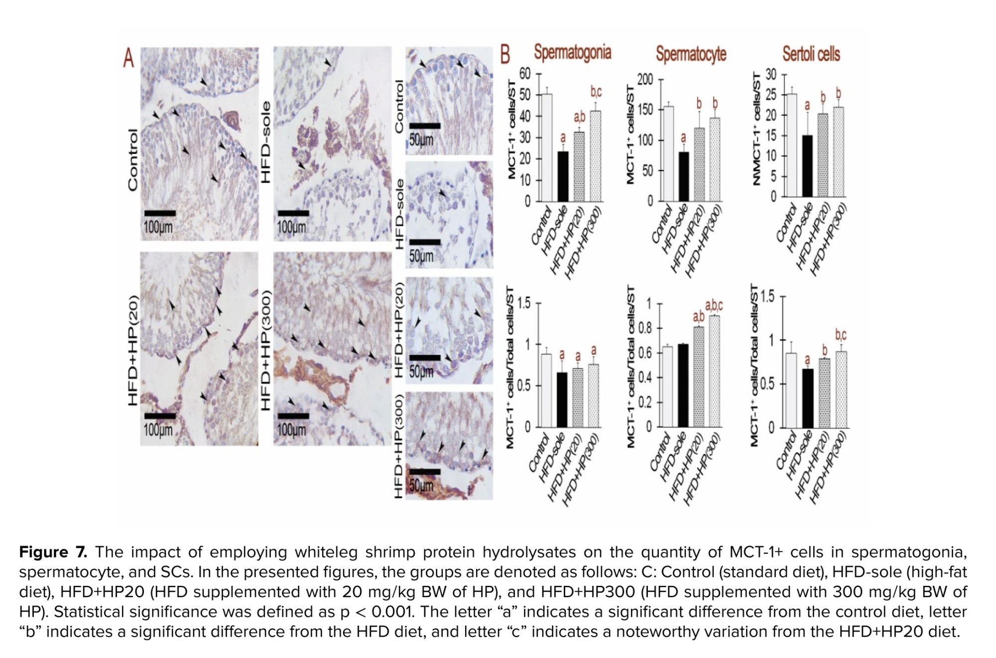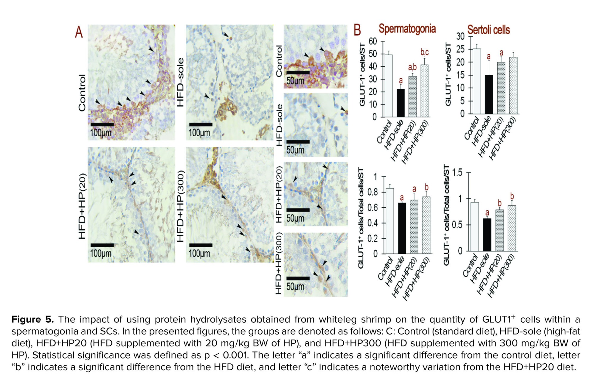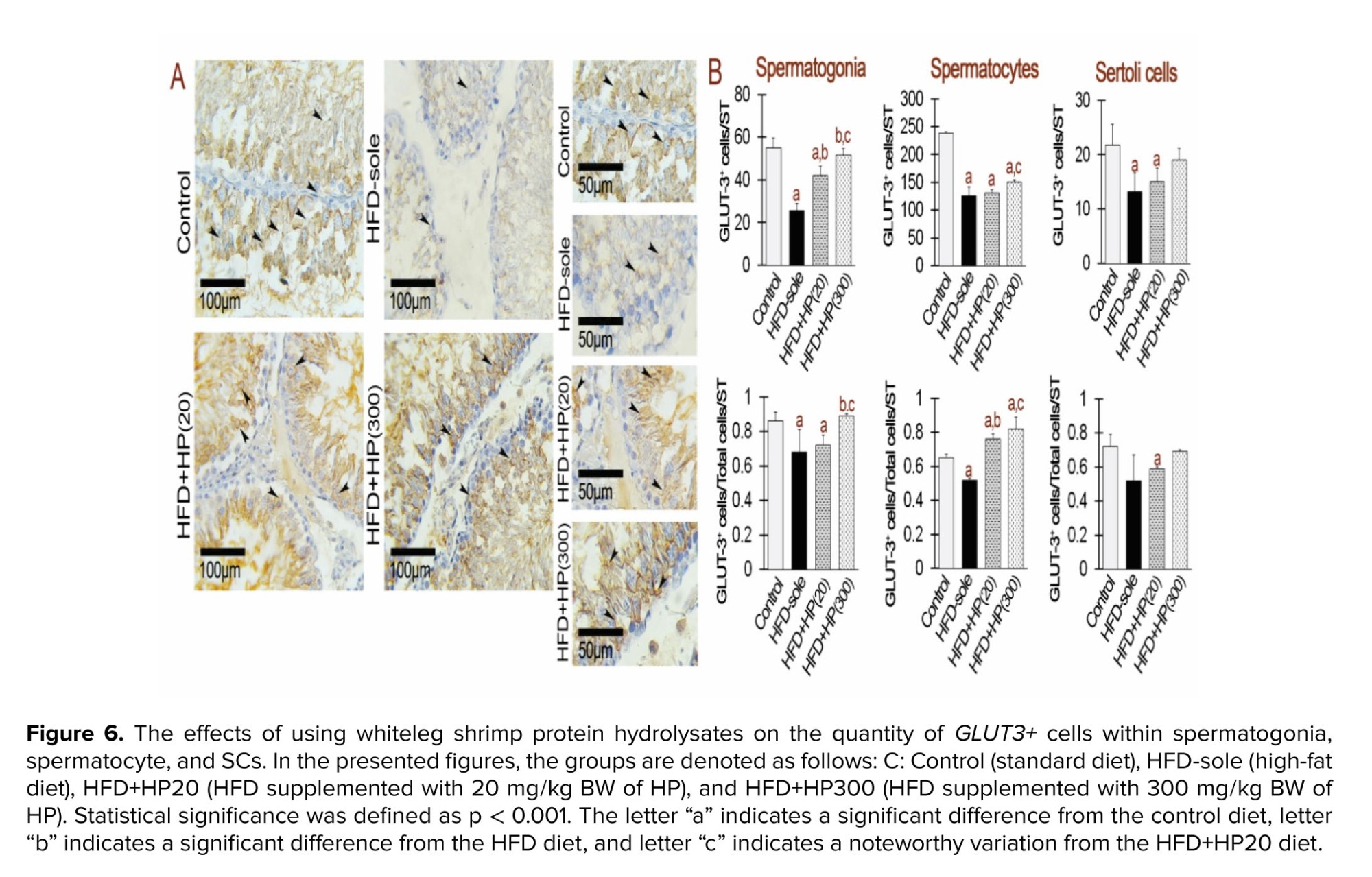 To the best of our knowledge, this is the first study to evaluate the protective effects of whiteleg shrimp bioactive peptides against NAFLD-induced testicular dysfunction. Unlike prior work focused mainly on hepatic parameters, the present investigation examines testicular redox balance, autophagy-related gene expression, and the distribution of major energy-transport proteins (GLUT1, GLUT3, MCT1, and MCT4) in Sertoli and germ cells. By combining biochemical measurements with morphometric and histological analyses, such as seminiferous tubule diameter, SCs counts, tubular differentiation index (TDI), and spermiogenesis index (SPI), this study provides new insights into how shrimp peptides help preserve spermatogenesis and testicular structure under metabolic stress. Accordingly, we aimed to determine the effects of HPs on OS, autophagy-related gene expression, and key energy transporters (GLUT-3, GLUT-1, and MCT-4) in NAFLD-associated testicular dysfunction.