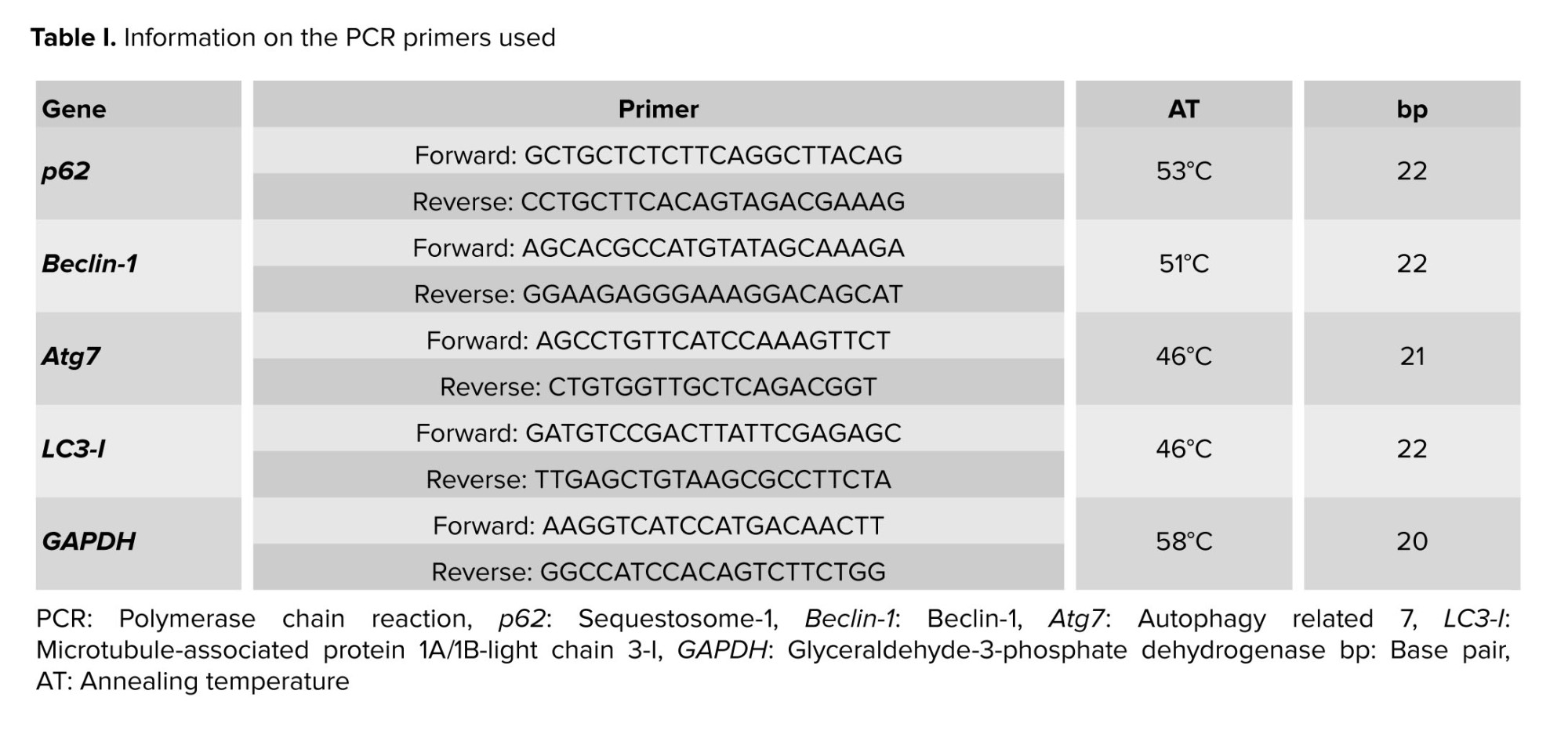 Total RNA was extracted from testicular tissue using TRIzol reagent (Thermo Fisher Scientific, USA) and assessed for quality and quantity using spectrophotometry. Only high-quality RNA samples were used for cDNA synthesis, which was performed using a commercially available reverse transcription kit. qRT-PCR was conducted on a MyGo PCR thermal cycler (Life Technologies) using SYBR green master mix (mention brand name and supplier) and gene-specific primers (Table I). GAPDH served as the internal control for calculating the relative gene expression levels using the 2^-ΔCt technique (21).