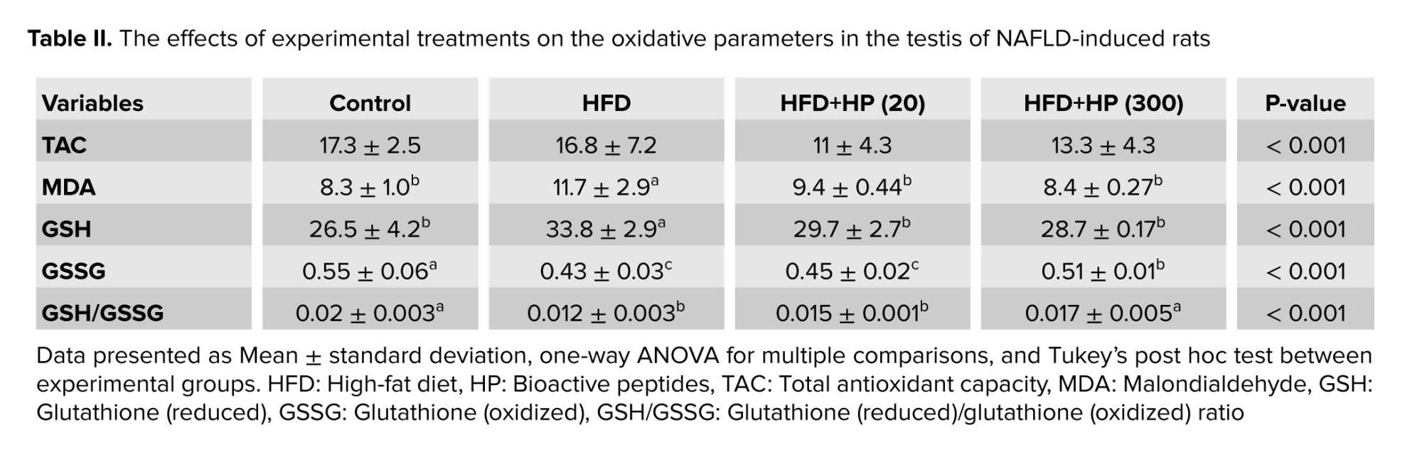Table II presents the OS indices across experimental groups. Testicular TAC remained unchanged among treatments. The HFD-sole group showed a significant elevation in MDA levels compared with the control (p < 0.001), whereas both HP-treated groups (HFD+HP20 and HFD+HP300) exhibited significantly lower MDA content (p < 0.001). MDA values in peptide-receiving rats did not differ from the control. In the HFD-sole group, GSH levels increased and GSSG levels decreased compared to control, leading to a reduced GSH/GSSG ratio. HP supplementation normalized GSH, GSSG, and the GSH/GSSG ratio, with the most pronounced recovery observed in the HFD+HP300 group.