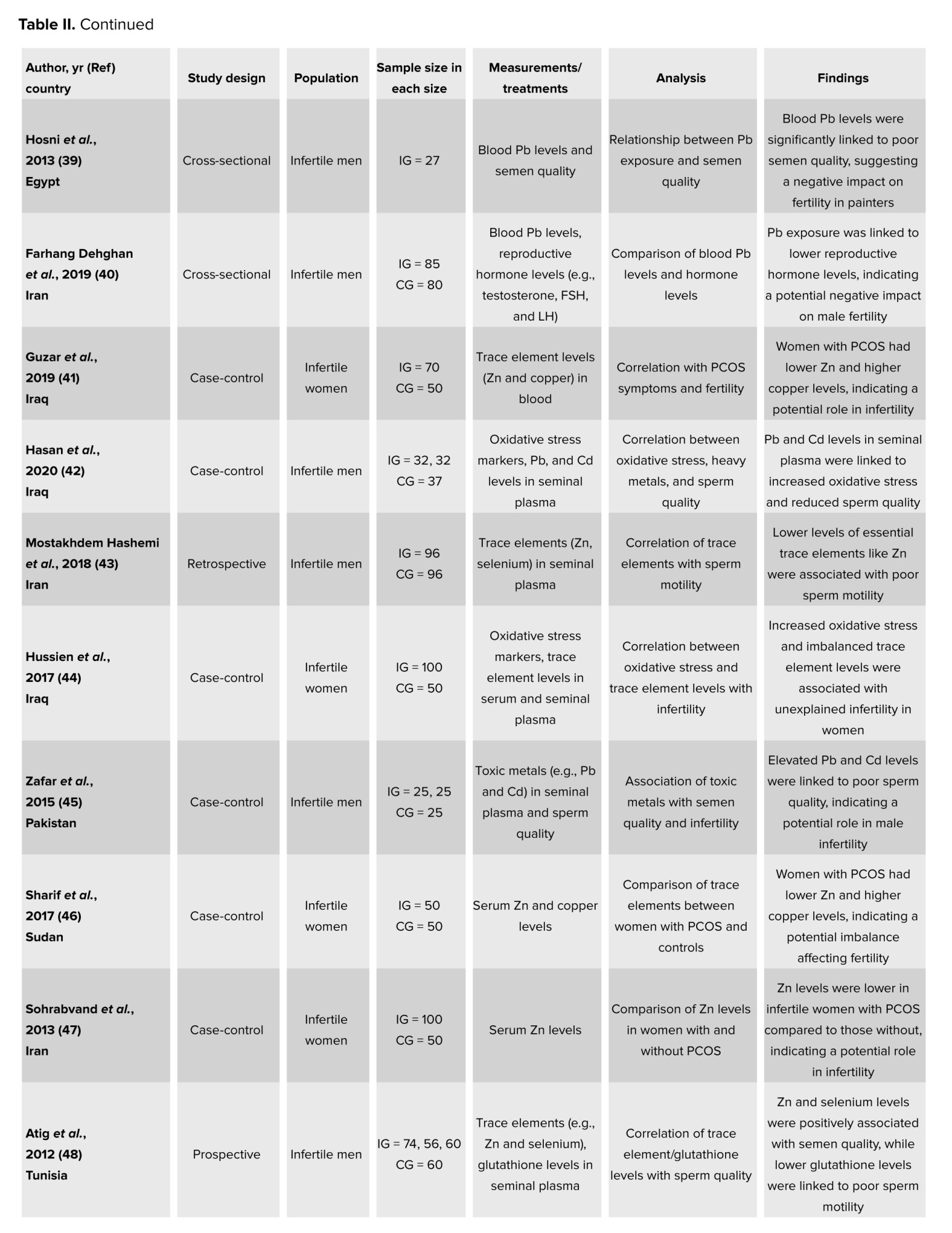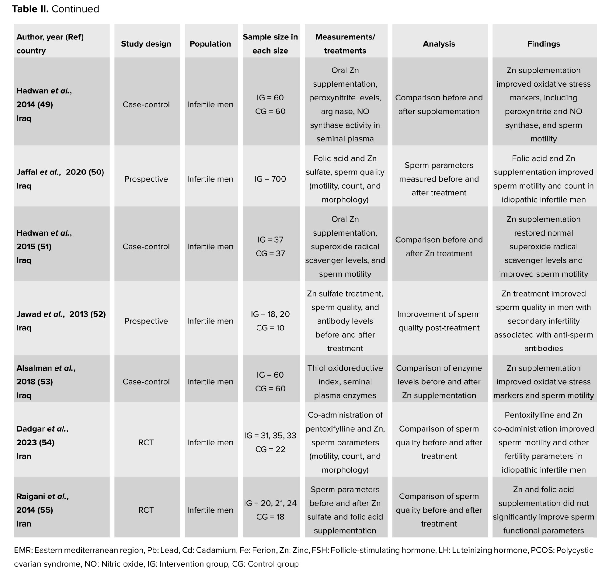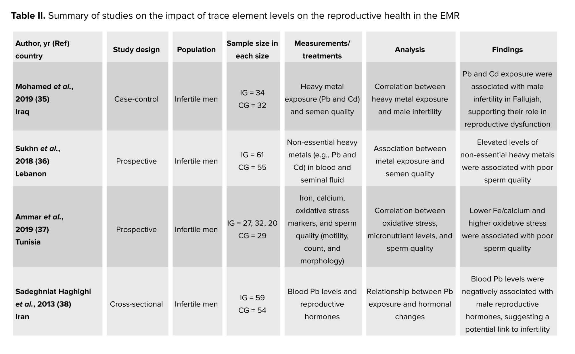 Trace elements, also known as trace metals, are minerals found in living organisms in minor quantities. If ingested in significant amounts over extended periods, any trace element can become harmful (34). Many publications focused on their impact on reproductive health in the EMR (Table II). In fact, these metals can affect human reproductive health in 2 ways: either directly, by targeting set reproductive organs, or indirectly, by working on the neuroendocrine system (35). Nonetheless, in general, these metals have been associated with a decline in fertility rates and were believed to negatively affect fine-tuning of biochemical reactions responsible for the regulation of the function of the male reproductive system (36, 37). In their case-control study, trace elements were found in higher levels in the 64 infertile males as compared to the 32 fertile men (35).