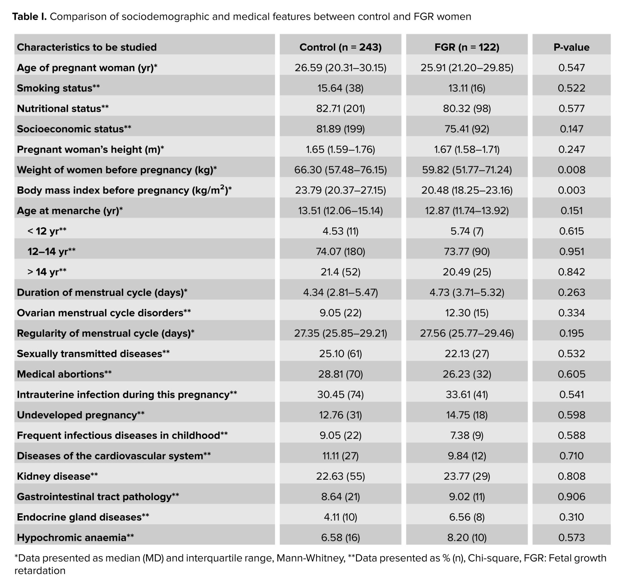 The analysis of clinical and anamnestic data of the study participants showed that the groups of pregnant women with FGR (n = 122) and the control group (n = 243) did not differ from each other in the vast majority of indicators considered (Table I). Women with FGR had lower weight (p = 0.008) and body mass index before pregnancy (p = 0.003) (Table I), and therefore these parameters (and the woman's age) were used as covariates in genetic calculations. Neonatal birth weight in the main group was 2647.26 ± 621.15 gr, and in the control group was 3463.26 ± 438.26 gr (p = 0.007). The height of newborns in the main group was 41.27 ± 2.41 cm and in the control group, 54.51 ± 2.26 cm (p = 0.081). For the remaining indicators, no statistically significant differences were found between the groups (Table I).