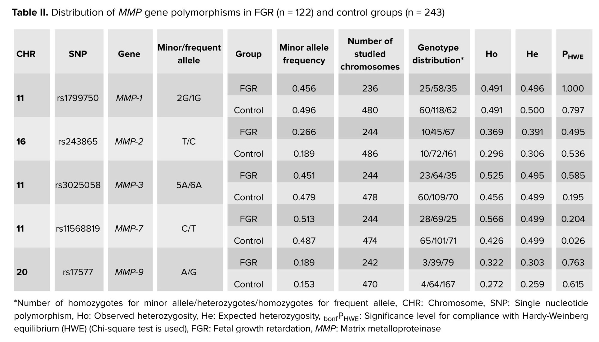 The etiology of FGR is complex, and various maternal, fetal, and placental factors are involved in its development (3-7). One of the important factors affecting fetal growth and development is matrix metalloproteinases (MMPs). The MMPs are a subfamily of zinc-dependent endopeptidases involved in the degradation of the extracellular matrix (5). Although MMPs are mainly characterized in tumor biology, they also play a crucial role during pregnancy (8, 9). Placental MMPs are essential for cytotrophoblast migration and invasion into the uterine wall, as well as for spiral artery remodeling. They are involved in cytotrophoblast fusion to form syncytiotrophoblast, as well as in angiogenesis (9). MMPs expression levels, as well as tissue inhibitors of metalloproteases expression levels, are closely associated with placental insufficiency. Studies have shown that decidual stromal cells expressing cluster of differentiation 82 upregulate tissue inhibitor of metalloproteinases-1 expression in an autocrine manner and inhibit human trophoblast cell invasiveness in the first trimester, partly through the integrin β1/mitogen-activated protein kinase signaling pathway. All these processes are crucial for the establishment and maintenance of a successful pregnancy, and an imbalance in these processes can lead to various abnormalities in the course of pregnancy (9, 10). Disruption of MMPs expression has been shown to be associated with pregnancy complications such as placental insufficiency, pre-eclampsia, FGR, gestational diabetes mellitus, and is also observed in maternal obesity (8, 10, 11). It should be noted that there is little data on the association of MMP polymorphisms with FGR, and thus, further research in this area is warranted.