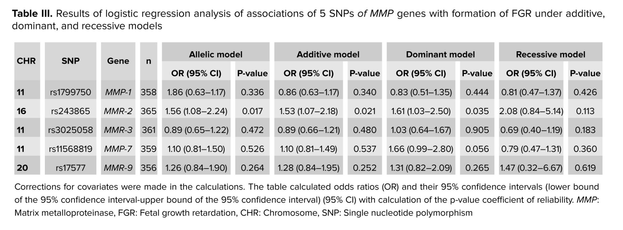 The study revealed that the T allele rs243865 of the MMP-2 gene is a risk factor for the development of FGR (OR = 1.53-1.61). This polymorphism is important for fetal development; it influences the development of various organs and systems (25). The location of rs243865 of the MMP-2 gene in the enhancer region in amnion and placental tissues is extremely important for the occurrence of intrauterine growth retardation (26).