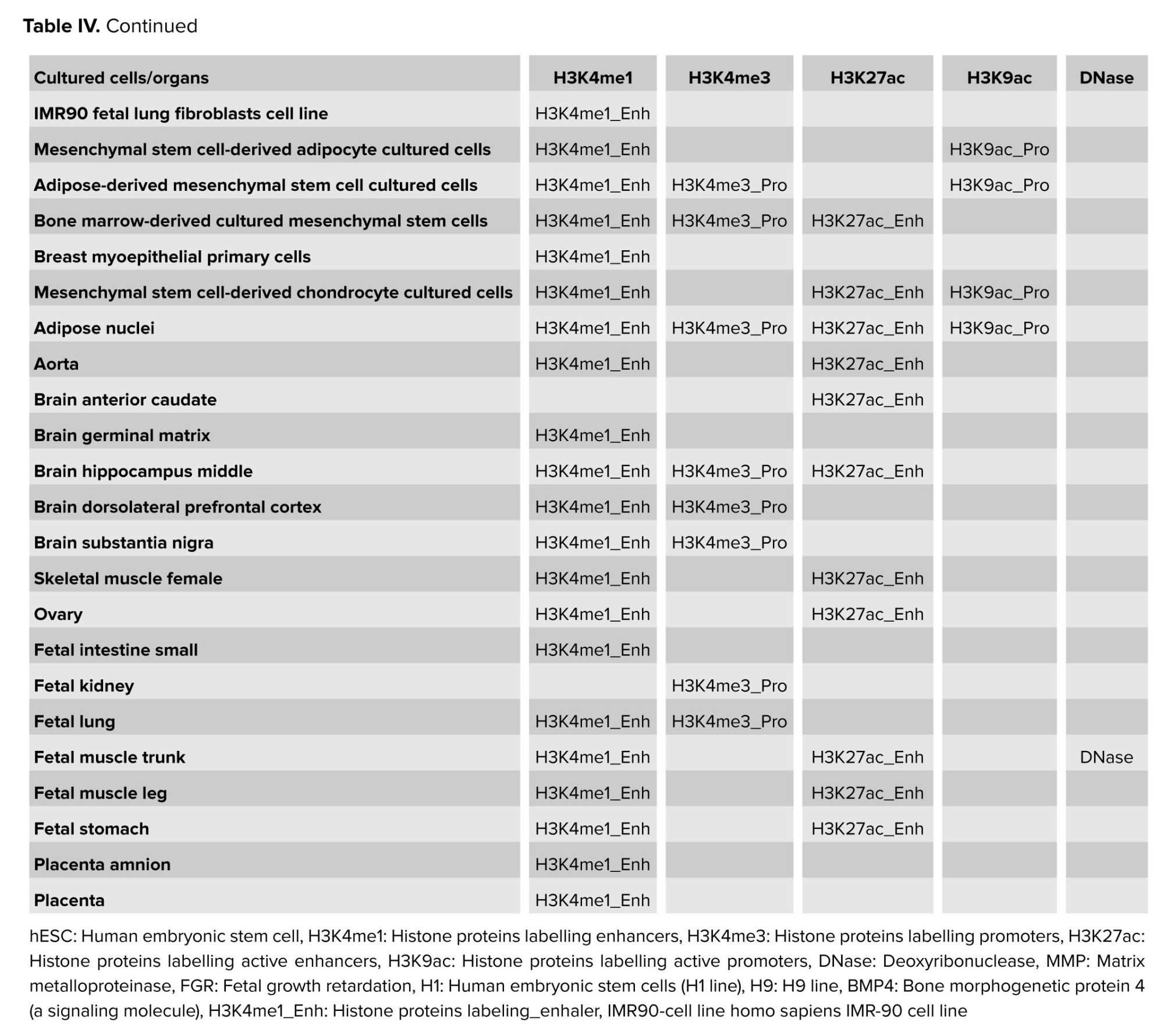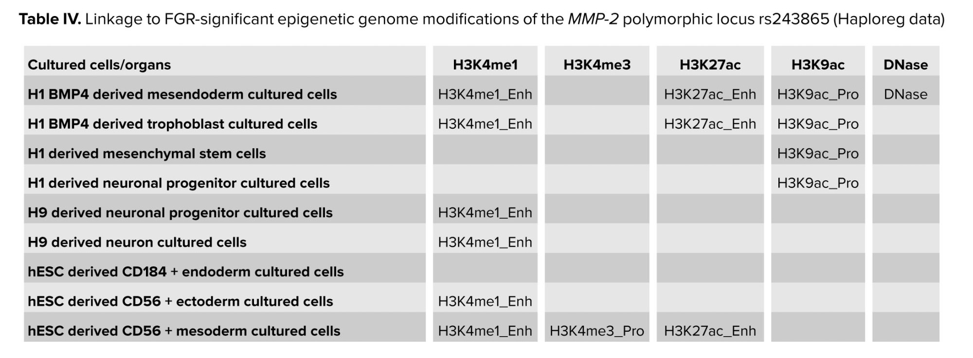 It should be noted that the polymorphic locus rs243865, which shows a major effect in the development of FGR (T allele is a risk factor OR = 1.53-1.61), according to Haploreg data, is located in the region of histone marking promoters and enhancers in many different cell cultures or organs (Table IV). It is located in the deoxyribonuclease-1 (DNase-1) hypersensitivity region and affects the affinity of DNA to myogenic factor (Myf) transcription (nucleotide substitution of C˃T rs243865 leads to decreased affinity of the genome region of the MMP-2 gene to Myf). Polymorphism affects epigenetic modifications in cell cultures and organs, which are important for the development of FGR, both in the embryo/fetus (cultures of trophoblast, ectoderm, mesoderm, etc., and lungs, muscles, etc.) and in the mother's body (ovaries, adipocytes, brain, muscles, etc.). The location of rs243865 in the enhancer region in the amnion and placenta tissues is extremely important for the occurrence of FGR (Table IV).