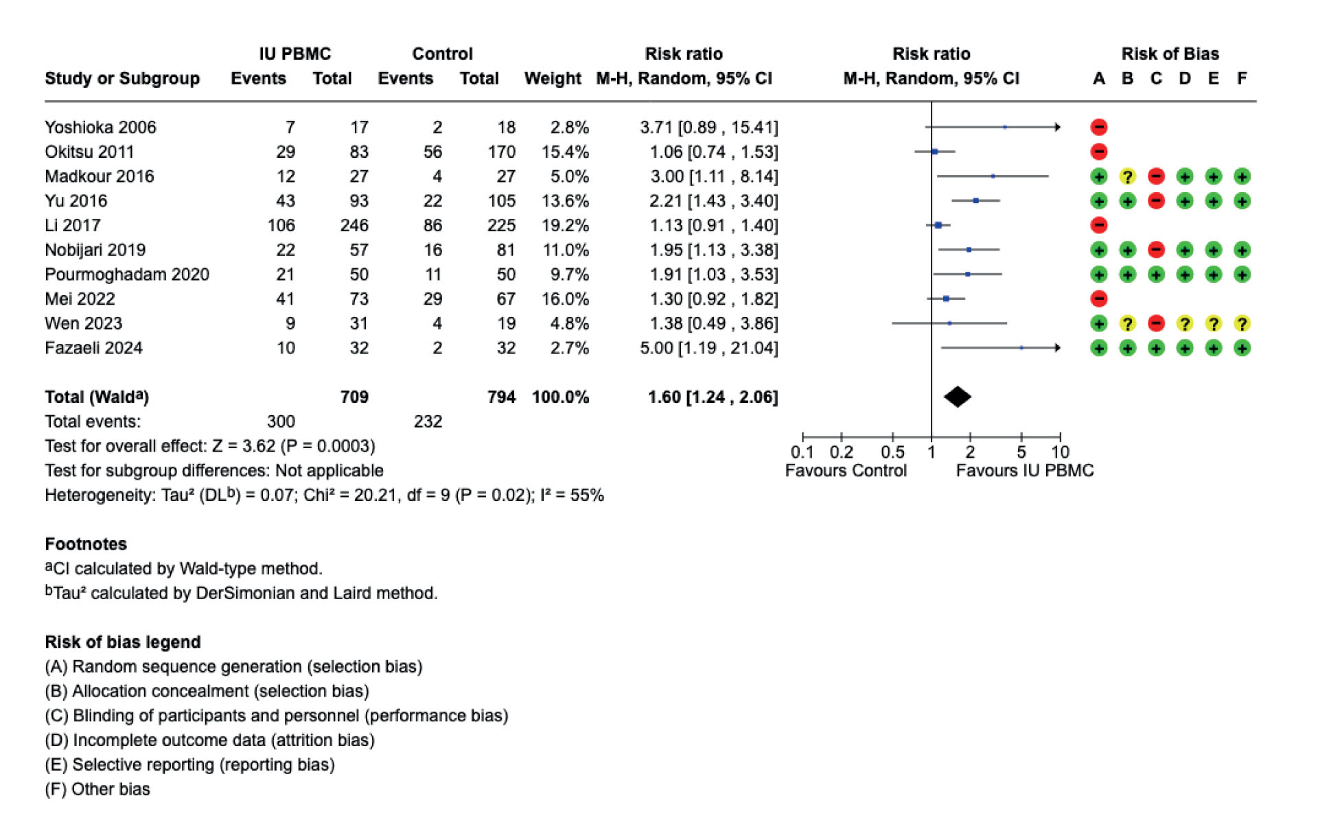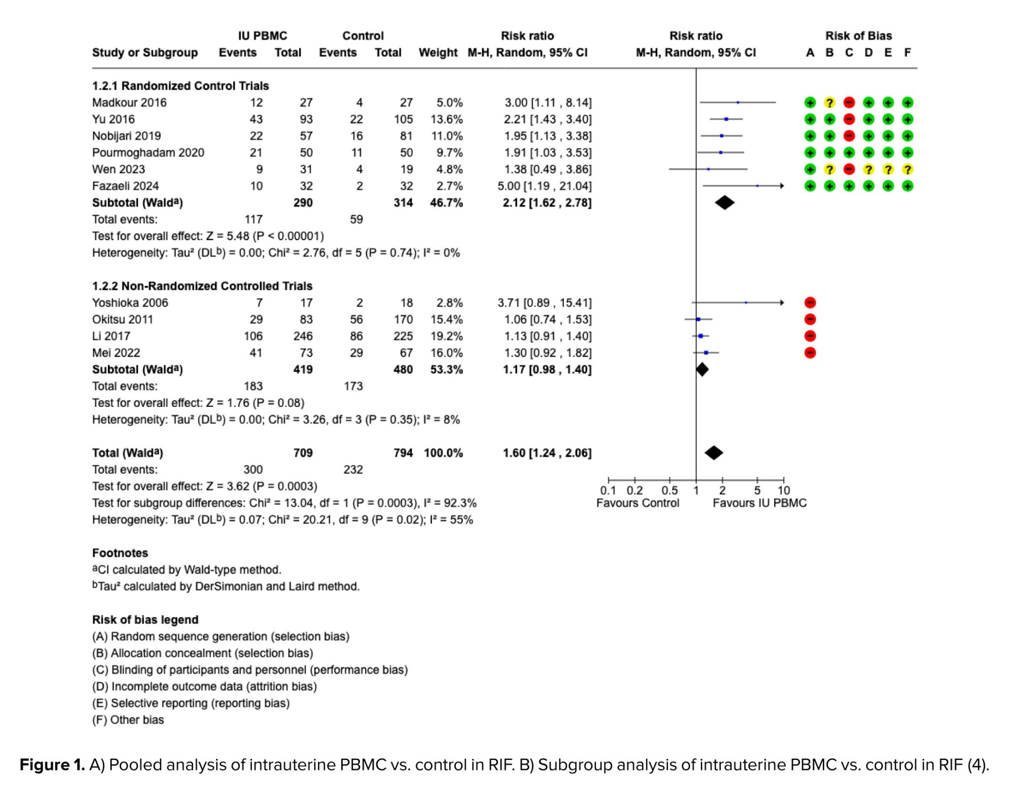 We systematically searched OVID MEDLINE and Embase from inception (1945 and 1974 respectively) to 22 October 2025. This meta-analysis was prospectively registered with the International Prospective Register of Systematic Reviews (ID: CRD42024421275) and performed according to the Preferred Reporting Items for Systematic Reviews and Meta-Analysis. Our results were presented at the recent International Federation of Fertility Societies World Congress, Tokyo, Japan (4). The results of our meta-analysis showed that a pooled analysis of 10 controlled clinical trials (n = 1503) comparing intrauterine PBMC with control (another standard stimulation cycle for embryo transfer) showed a modest effect size of risk ratio (RR) = 1.60 (1.24-2.06). Upon visual inspection of the forest plot, moderate heterogeneity was observed with poor alignment of 95% confidence interval (CI), statistically significant at p = 0.02 and I2 = 55% (Figure 1A). An investigation of heterogeneity using subgroup analysis considering “trial randomization” demonstrated 2 distinct, homogenous effect sizes with non-overlapping 95% CI. The efficacy of intrauterine PBMC in 6 randomized controlled trials (n = 604), was RR = 2.12 (1.62-2.78, p = 0.74 and I2 = 0%) compared to 4 non-randomized controlled trials (n = 899), RR = 1.17 (0.98-1.40, including 1.0 and hence statistically insignificant, p = 0.35 and I2 = 8%), respectively (Figure 1B). The combination of distinct, homogenous effect sizes with non-overlapping 95% CI and p = 0.0003 and I2 = 92.3%, suggests that differing trial design was the sole source of heterogeneity/conflict.