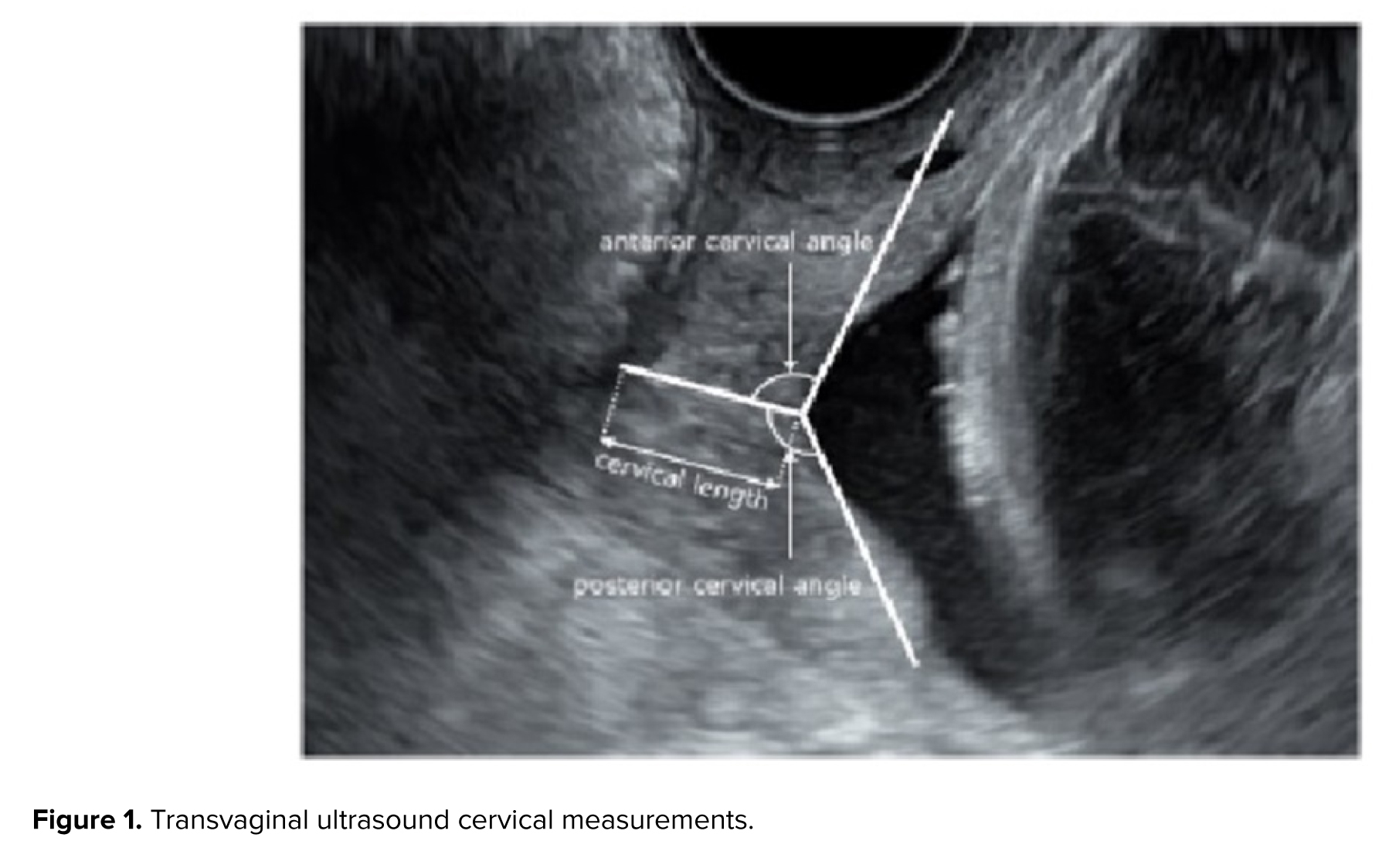 Ultrasound examinations were performed by an experienced sonographer using a Philips Affinity 50 ultrasound machine equipped with a 5-9 MHz transvaginal probe. Women were placed in the supine position with hips flexed and abducted, knees flexed, and with an empty bladder. The vaginal transducer was covered with a single-use sterile vinyl sheath. Care was taken to ensure that the ultrasound images included both the internal and external cervical os (the opening of the cervix) as well as the outermost part of the fetal presenting part. The CL was measured as the distance between the internal and external cervical os. The anterior and posterior CA were calculated by drawing 2 lines converging at the internal cervical os. Specifically, the posterior CA was defined as the angle between an imaginary line crossing the cervical canal and another tangential to the posterior uterine wall at its junction with the internal os, assessed in the sagittal plane at the level of the internal os. Presence of funneling was also recorded (Figure 1).