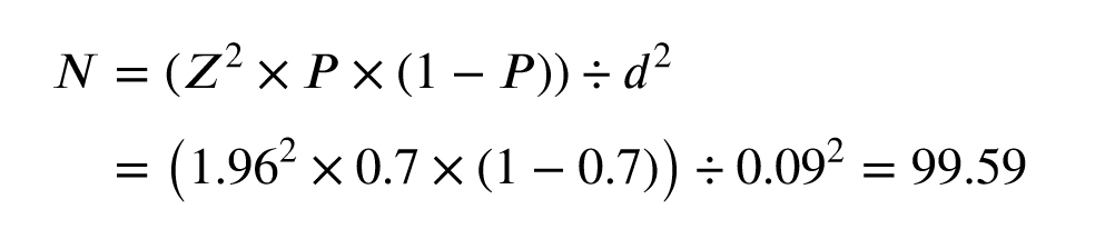 The sample size was calculated using the standard formula for prevalence estimation in cross-sectional studies, assuming a conservative prevalence (p) of 70% (α = 0.7) to maximize the required sample size and a margin of error (d) of 9% (d = 0.09). The calculation yielded: