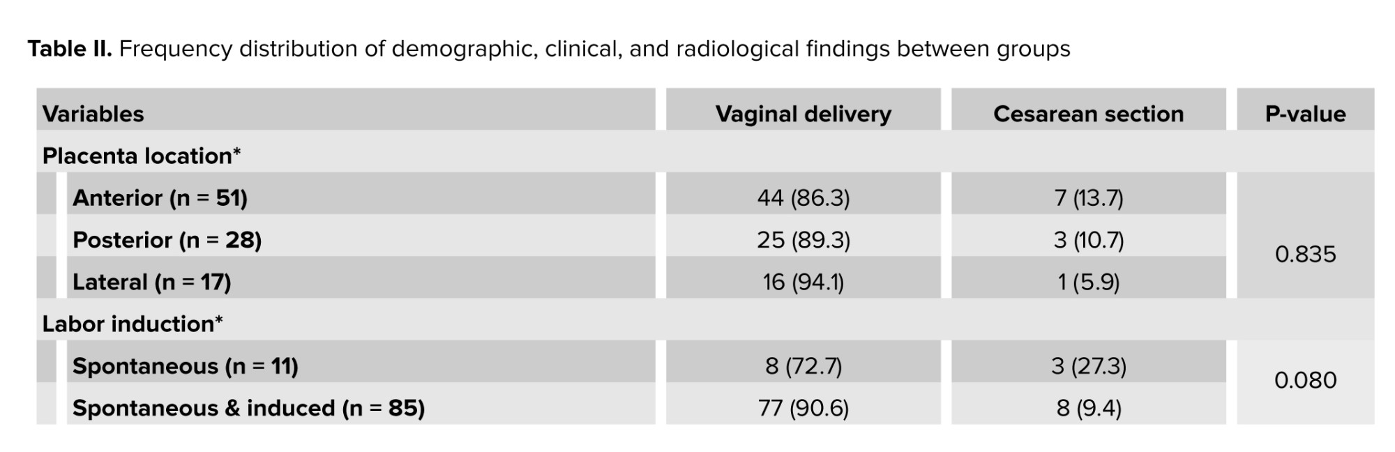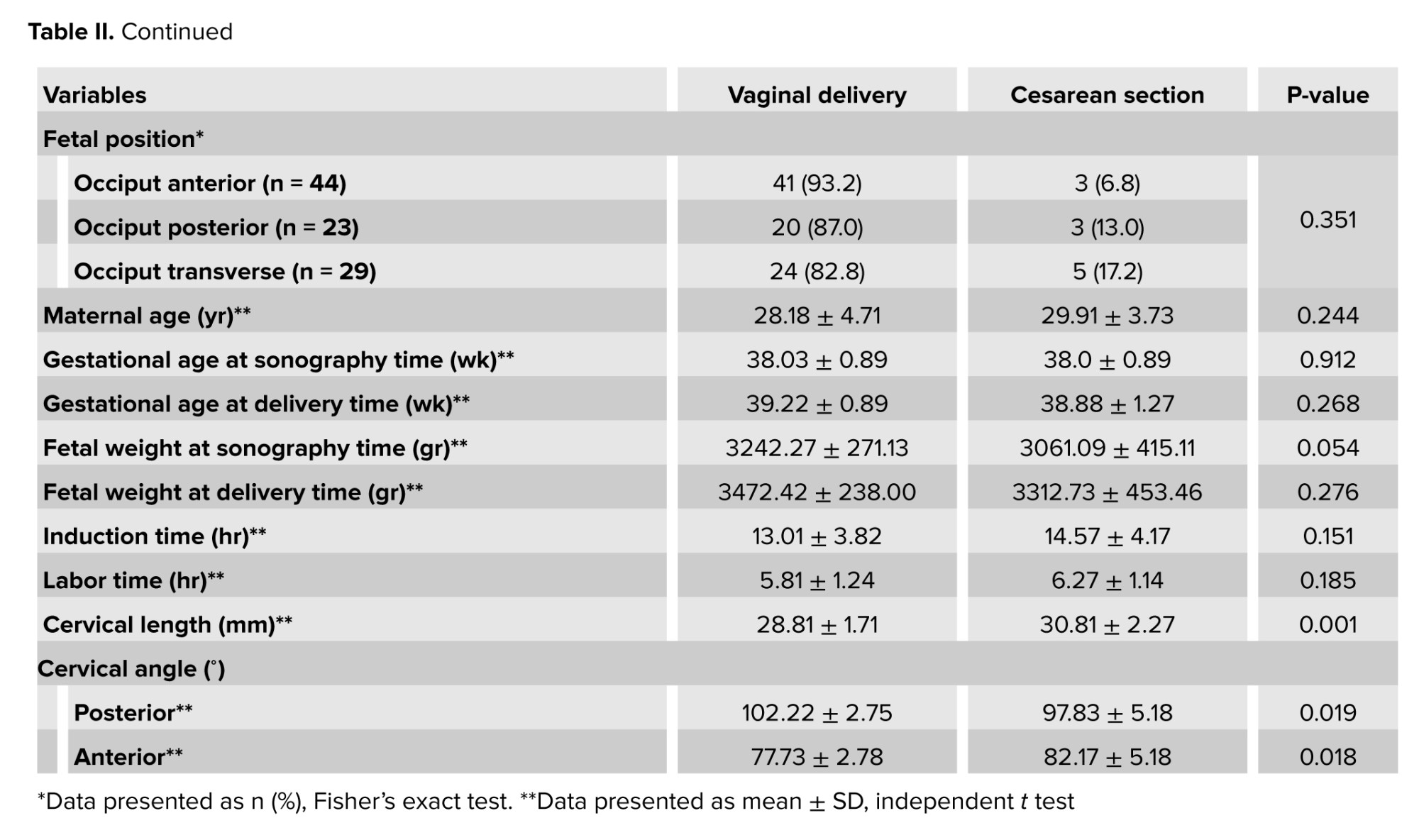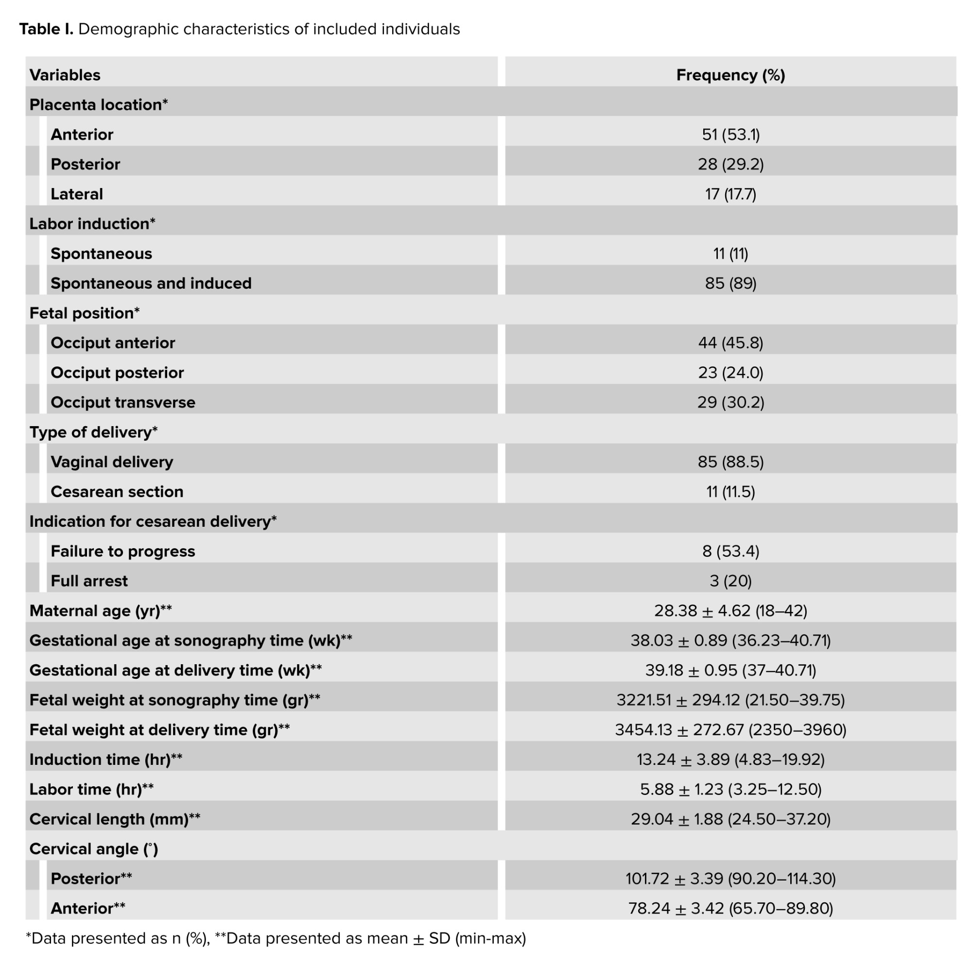 In this cross-sectional study, a total of 100 eligible participants were included in the study, with 4 exclusions during the initial stage. The participants comprised nulliparous pregnant women at 37 wk or later who had visited Imam Khomeini hospital, Tehran, Iran. Among them, 11 individuals underwent cesarean sections (failure to progress during labor was the most commonly observed reason), while 85 individuals had successful vaginal deliveries. The results indicated that the anterior was the most common regarding placenta location. Among labor induction methods, a combination of spontaneous and induced was the most common. Fetal positioning was classified into occiput anterior, posterior, and transverse orientations, with the occiput anterior predominant. Delivery was commonly done through the vaginal route, with a smaller proportion resulting in cesarean sections. Average maternal age were the ones in their late twenties, while gestational ages at both sonography and delivery times were typically near full term. Fetal weights at both sonography and delivery times reflect a range of healthy weights. The mean induction time was longer than half a day, alongside labor duration, which is relatively brief. Additionally, cervical measurements such as length and angles are documented, indicating a range of anatomical variations during the delivery process (Table I).
