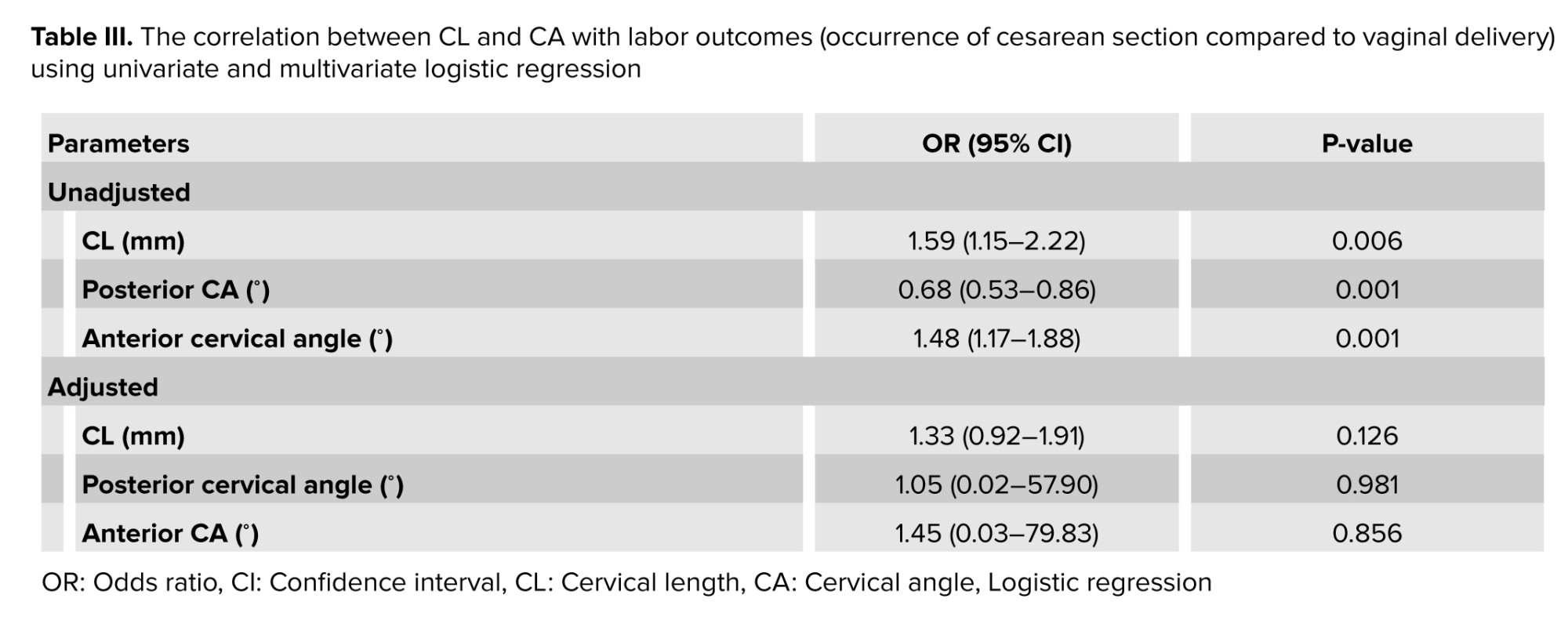 In the analysis of diagnostic parameters related to successful labor delivery, both univariate and multivariate regression models were employed to assess the influence of CL and CAs. The unadjusted model indicated that CL was positively associated with a cesarean section with an OR of 1.59, indicating that an increase of each millimeter of CL may increase the 59% likelihood of cesarean section; while the posterior CA showed a negative association, suggesting that an increase in this angle may decrease the 32% likelihood of cesarean section occurrence.