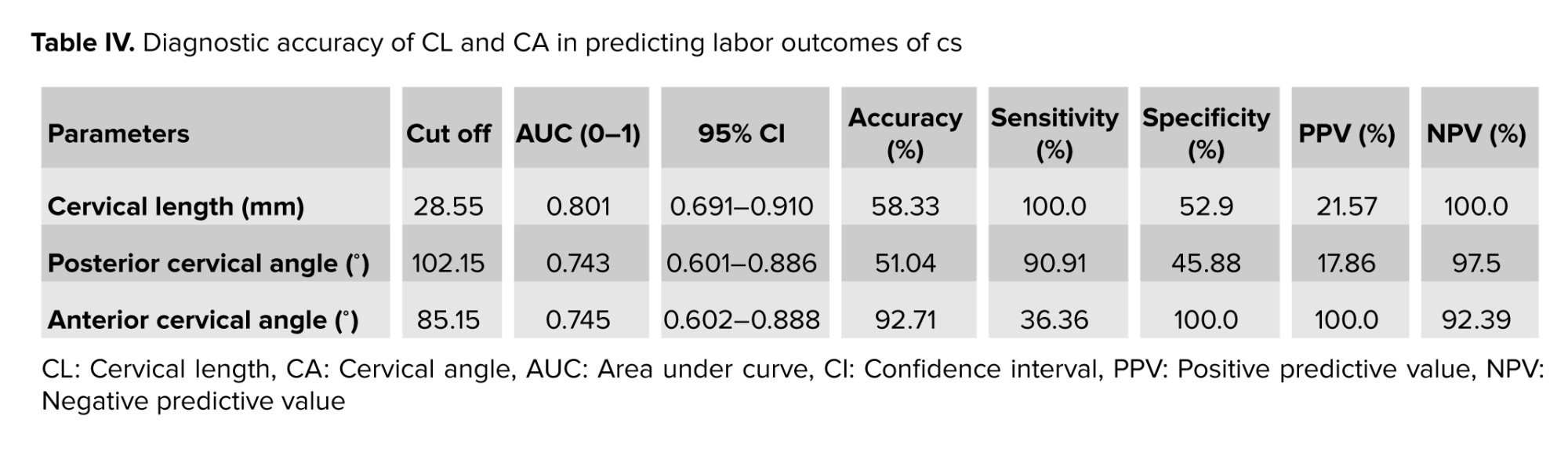Univariate and multivariate logistic regression analyses were employed to predict delivery mode, calculating odds ratios (ORs) with 95% confidence intervals (CIs). The optimal cut-off values for CL, posterior CA, and anterior CA were determined through receiver operating characteristic (ROC) curve analysis, utilizing the area under the ROC curve (AUC) to compare each parameter's predictive effectiveness. Additionally, diagnostic accuracy metrics such as sensitivity, specificity, PPV, NPV, and overall accuracy were computed for CL and both angles. P < 0.05 was considered statistically significant.