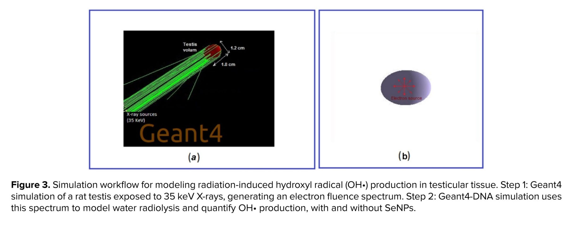 In the first stage, a rat testis was irradiated with parallel 35 keV X-rays incident on one face, simulating 106 photons (Figure 3a). Subsequently, for the Geant4-DNA radiolysis simulation, an isotropic point-like electron source with a spectrum derived from a previous Geant4 simulation was positioned at the center of a testis volume containing 20 nm spherical SeNPs at concentrations from 2-15 mg/L (Figure 3b). The number of OH• produced, and the corresponding G-values were computed for each SeNP concentration.