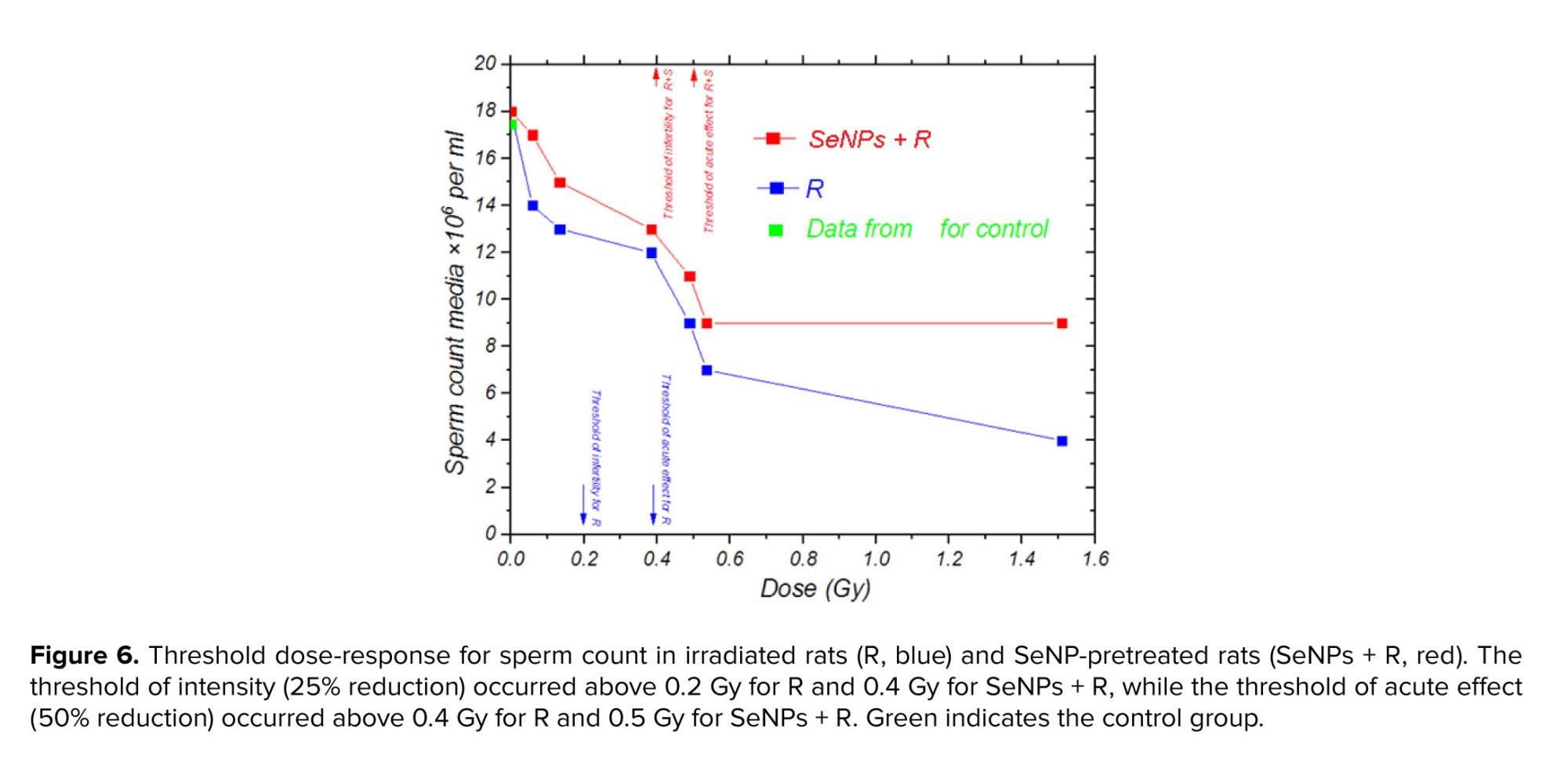 The laboratory results of sperm count, as illustrated in figure 6, demonstrated a 25% reduction at doses above 0.2 Gy (0.4 Gy in SeNP-treated rats), highlighting the high sensitivity of the male reproductive system to relatively low radiation exposures. A more pronounced decline of 50% was observed at doses exceeding 0.4 Gy (0.5 Gy in SeNP-treated rats). These findings suggest that infertility in rats may occur at doses above 0.2 Gy, with acute and severe alterations becoming evident beyond 0.4 Gy. The delayed onset of these effects in SeNP-treated rats likely reflects the antioxidant and radioprotective properties of SeNPs, which scavenge free radicals, attenuate oxidative stress, and protect DNA integrity. This result supports the potential of SeNPs as a mitigating agent against radiation-induced reproductive toxicity.