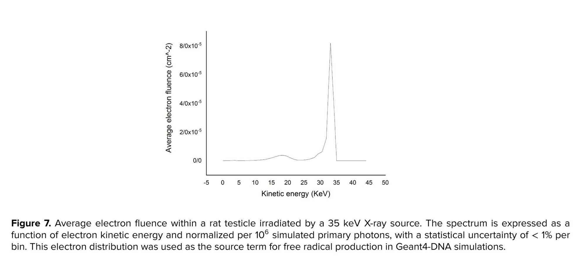 - Geant4 simulation: Geant4 (v11.2.1) was used to obtain the average electron fluence spectral distribution inside a testicle irradiated with 35 keV parallel X-rays.