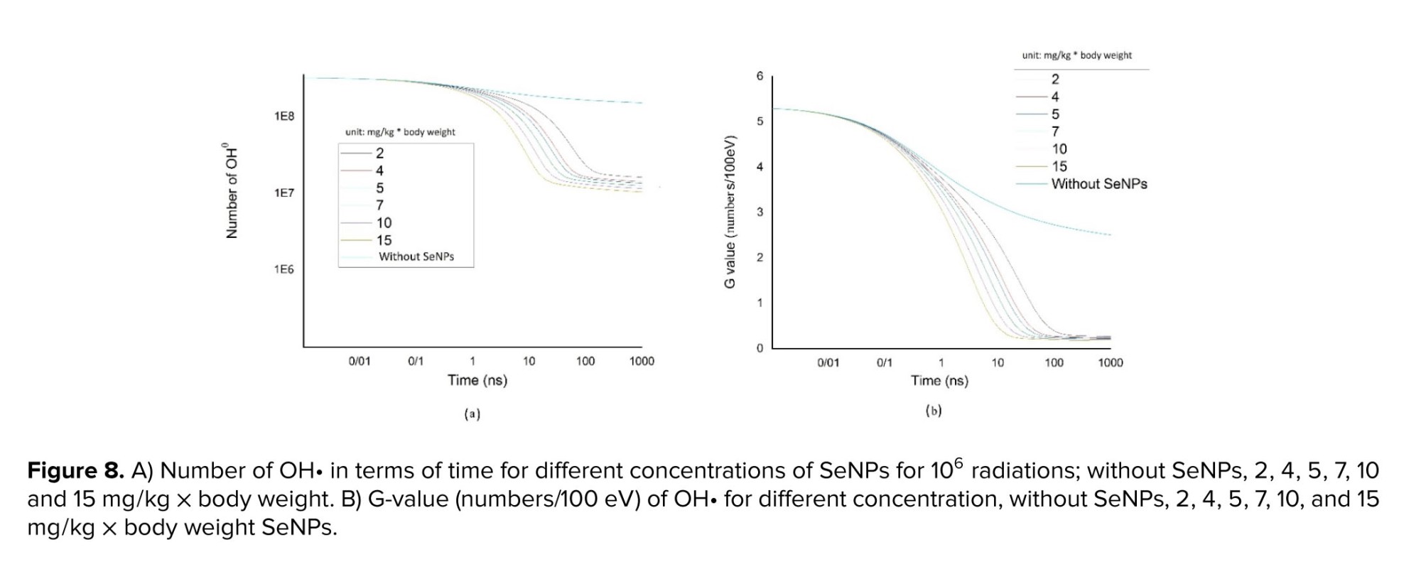 The number of OH• species and G-values exhibit a decreased over time in the presence of SeNPs, as shown by figure 8a and b. Additionally, both figures demonstrated a further decline with increasing SeNPs concentration, with the steepest decline observed in time intervals ranging from 0.1-100 nanoseconds. The subsequent section will compare and analyze these simulation results with experimental data available from other studies.