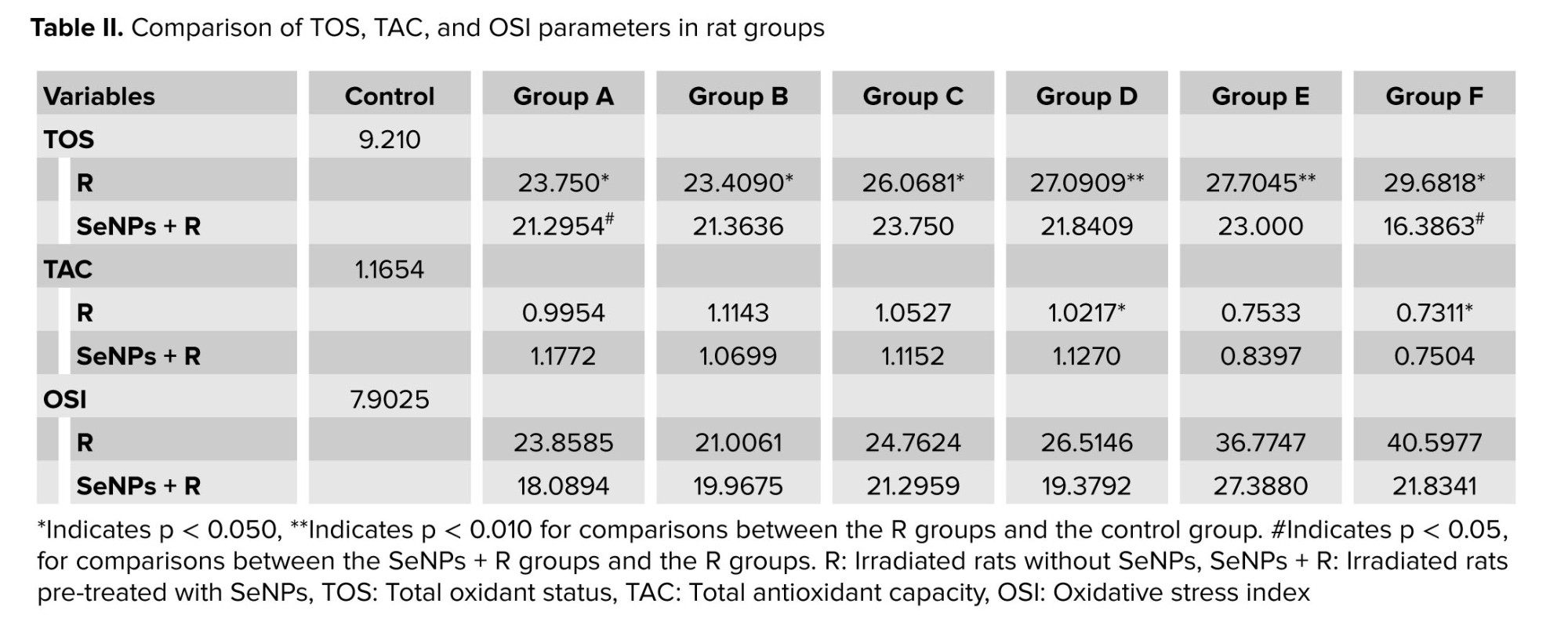 Comparing the control and R groups (irradiation groups without SeNPs), statistically significant differences were found in TOS (p = 0.005) and TAC (p = 0.044) values, with TOS increasing and TAC decreasing after radiation exposure (Table II). The effect of radiation on the TOS value was significant when comparing the R groups with the control group, with significant reduction in TAC values observed in groups D and F (Table II). Overall, results showed that after radiation exposure, TOS and OSI increased while TAC decreased. Additionally, increasing radiation dose led to higher TOS and OSI values and lower TAC values. Notably, SeNPs generally reduced TOS and OSI values while raising TAC values, as demonstrated in table II.